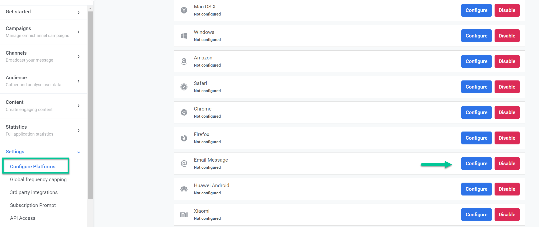 Для этого перейдите в Настройки, выберите Настроить платформы и нажмите Продолжить настройку рядом с платформой Email.