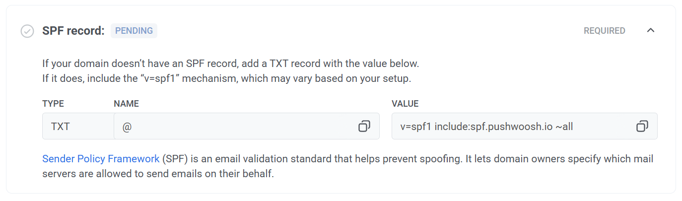 "v=spf1 include:spf.wavesend.io ~all"В зависимости от вашего DNS-провайдера, имя записи может быть пустым или иметь значение @.