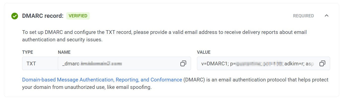 Section titled “Верификация DMARC (обязательно)”DMARC (Domain-based Message Authentication, Reporting, and Conformance) — это протокол аутентификации электронной почты, который помогает защитить ваш домен от несанкционированного использования, такого как спуфинг.