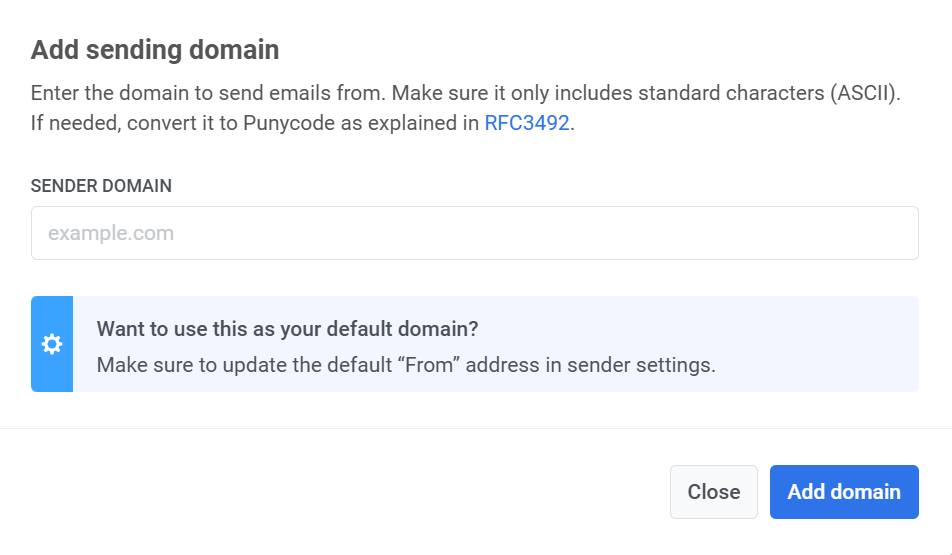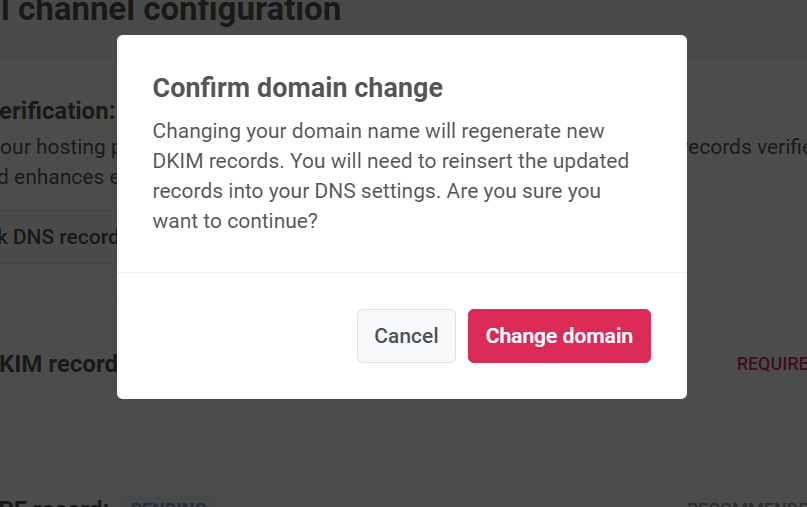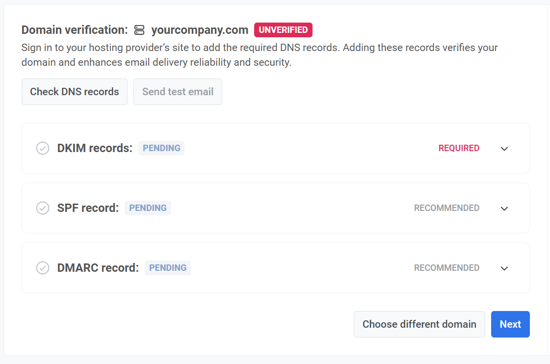 Section titled “Выбор другого домена”Если на этом шаге вы поняли, что вам нужно изменить домен, нажмите Choose different domain. Затем вы сможете добавить новый домен отправителя.