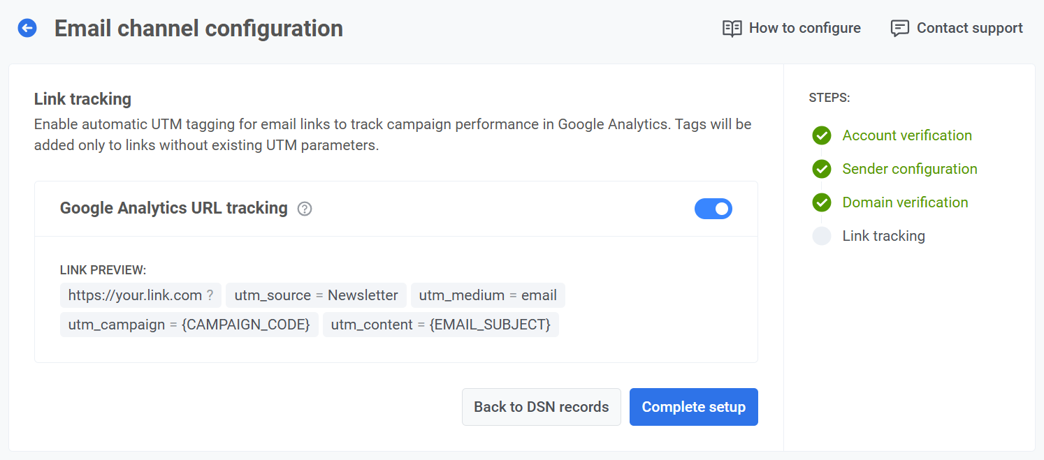- После настройки UTM-параметров нажмите Complete setup, чтобы сохранить настройки.