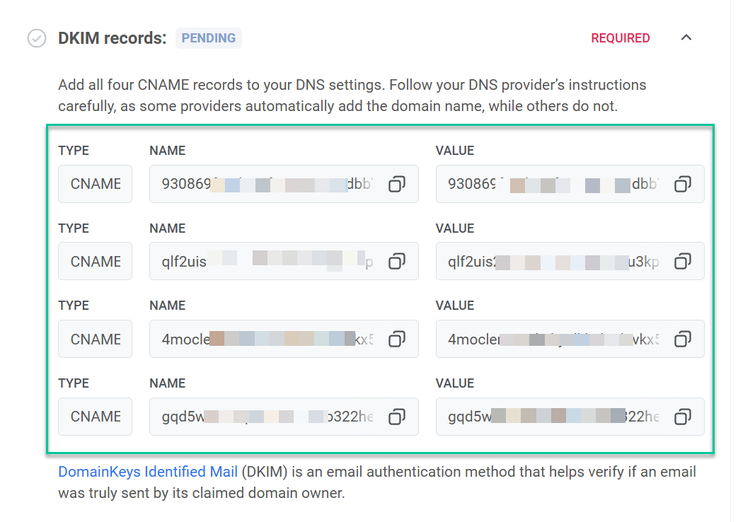 Скопируйте записи CNAME и добавьте их в настройки DNS.