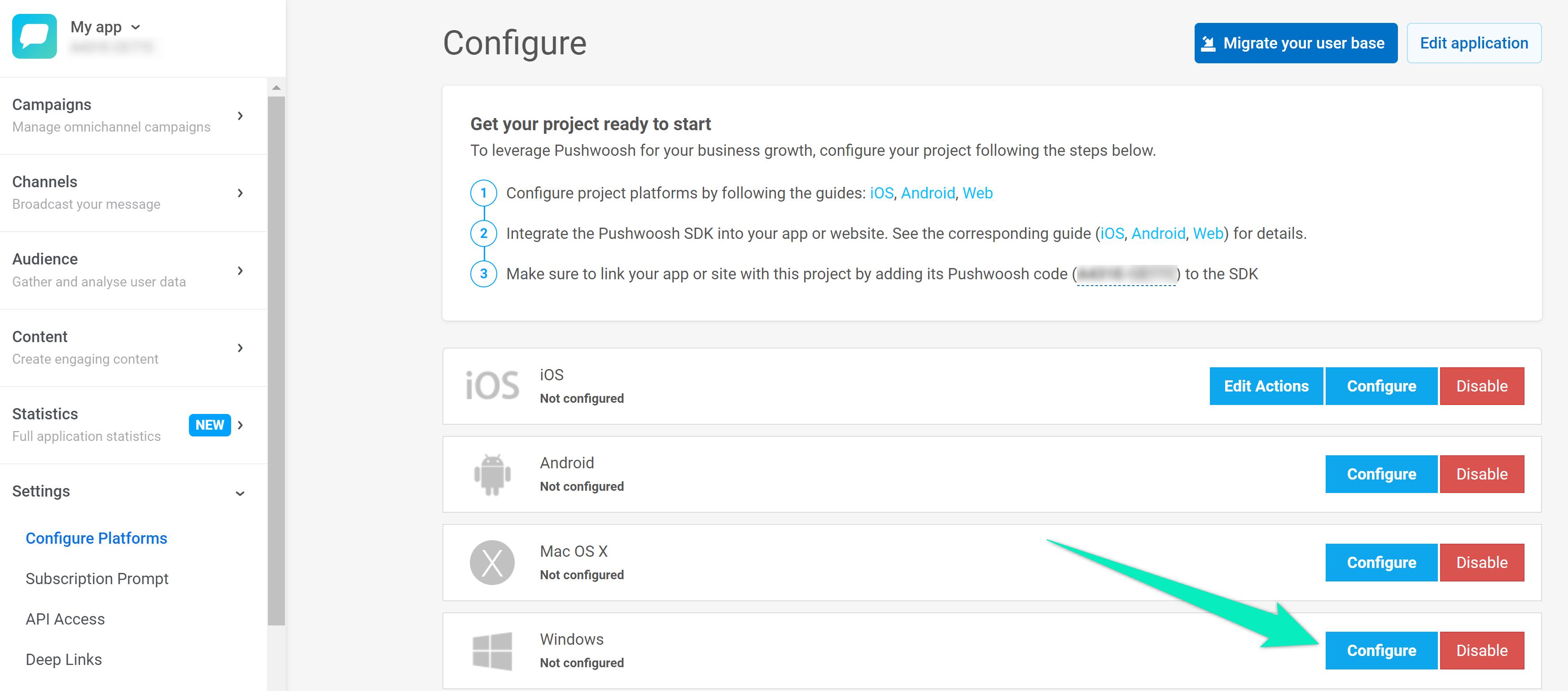 Section titled “Настройка Wavesend”1. В вашем проекте Wavesend перейдите в раздел Configure Platforms и нажмите Configure в строке Windows: