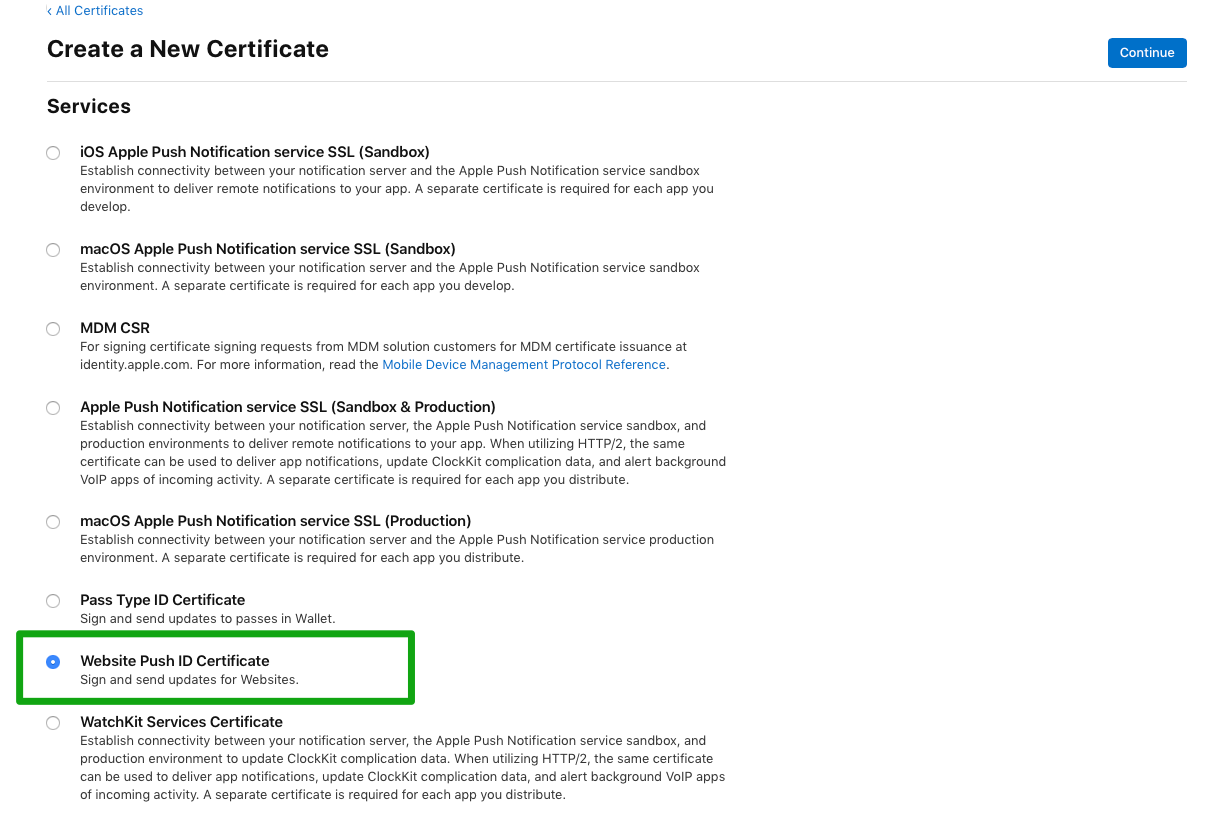 3. Выберите тип Website Push ID Certificate и нажмите Continue.