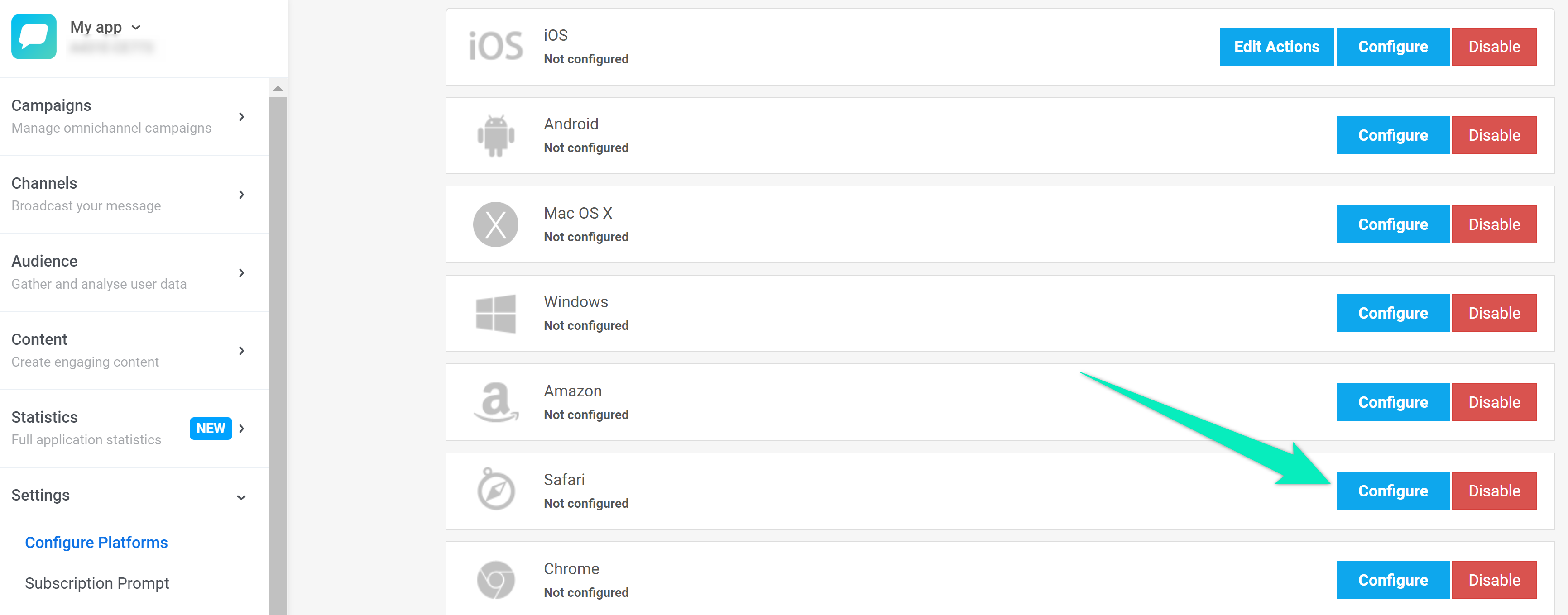 Section titled “Настройка платформы Safari в вашем проекте Wavesend”1. В вашем проекте Wavesend перейдите в раздел Configure Platforms и нажмите Configure в строке Safari: