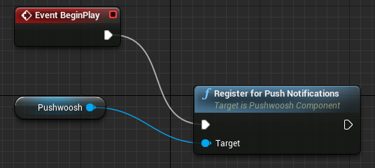 10. Откройте вкладку Event Graph в редакторе Blueprint. Найдите действие Register for Push Notifications в категории Wavesend. Добавьте его на ваш граф и присоедините к соответствующей цепочке выполнения (это приведет к появлению на iOS всплывающего окна с запросом разрешений на push-уведомления).