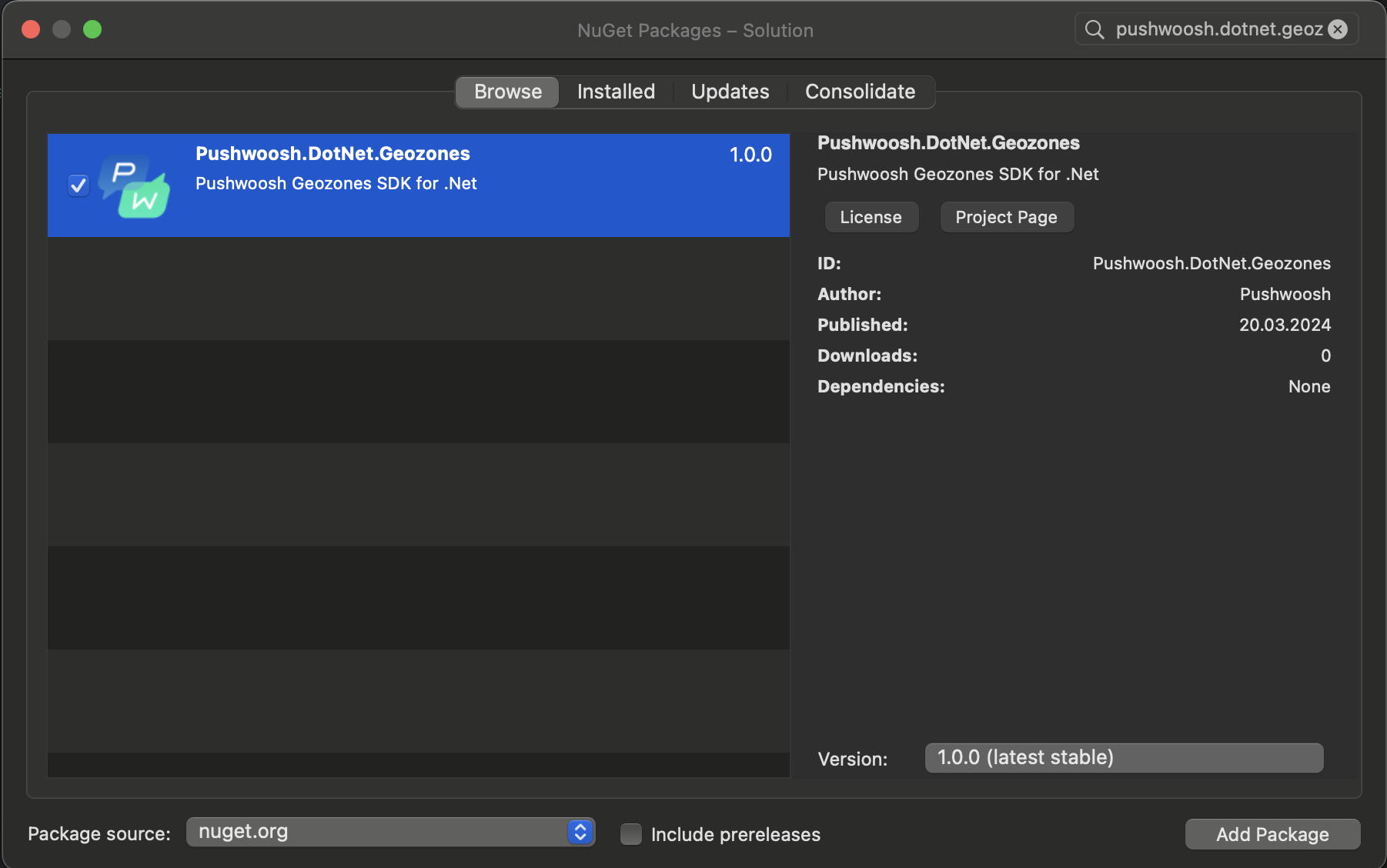 - Добавьте NuGet-пакет Wavesend.DotNet.Geozones в ваше решение.