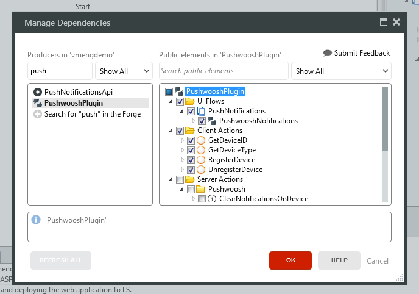 Section titled “Установка плагина Wavesend”Начните с установки плагина Wavesend из OutSystems Forge. Самый быстрый способ сделать это — перейти на вкладку OutSystems в вашей среде разработки и установить его оттуда.