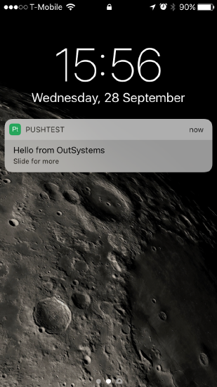 Например, если вы используете это действие для отправки сообщения «Hello from OutSystems» в приложение под названием «PushTest», в iOS будет показано следующее: