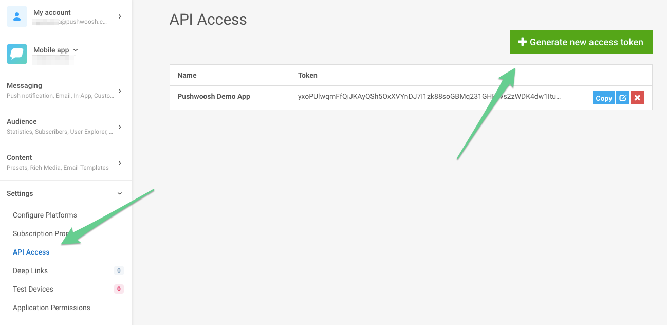 Section titled “Отправка уведомлений”Для отправки уведомлений вам понадобится API Access Token Wavesend. Создайте его, зайдя в консоль Wavesend, перейдите в раздел «API Access» и нажмите «Generate new access token».
