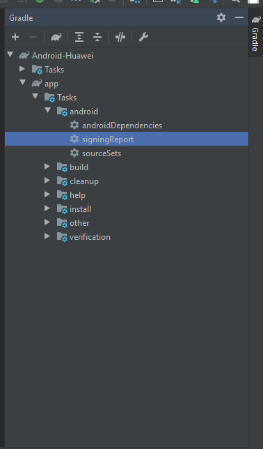- В открывшемся окне перейдите в app > Tasks > android > signingReport.