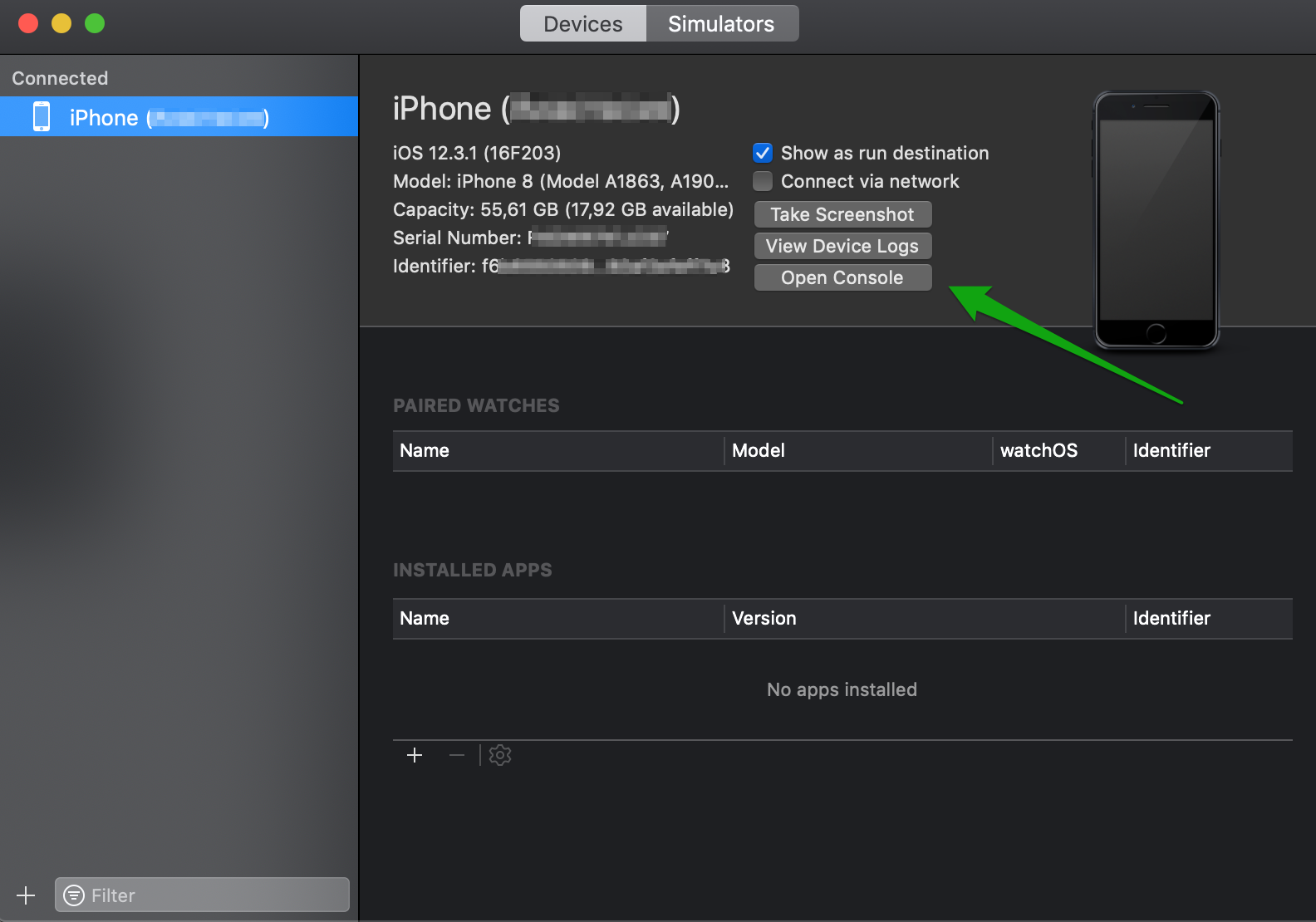 Section titled “В: Как мне получить push-токен моего iOS-устройства для использования в ‘Test Devices’?”Чтобы получить push-токен вашего iOS-устройства: