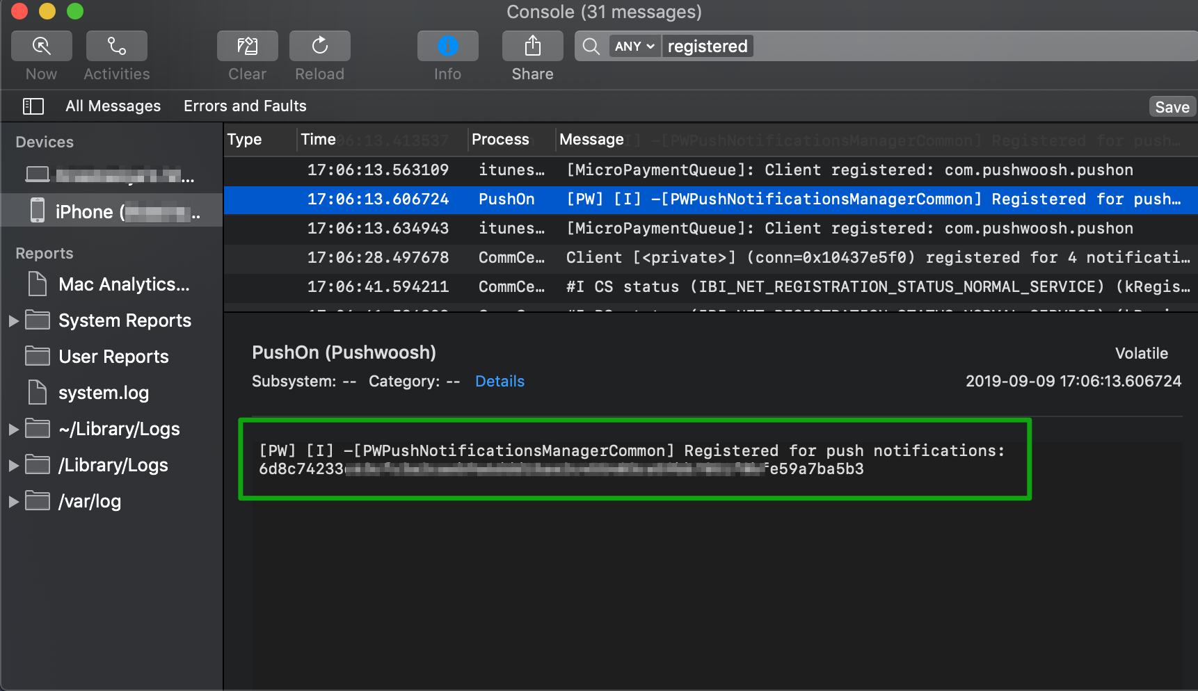 Запустите приложение, для которого вам нужен push-токен, и найдите свой push-токен из 64 шестнадцатеричных символов в строке “Registered for push notifications”: