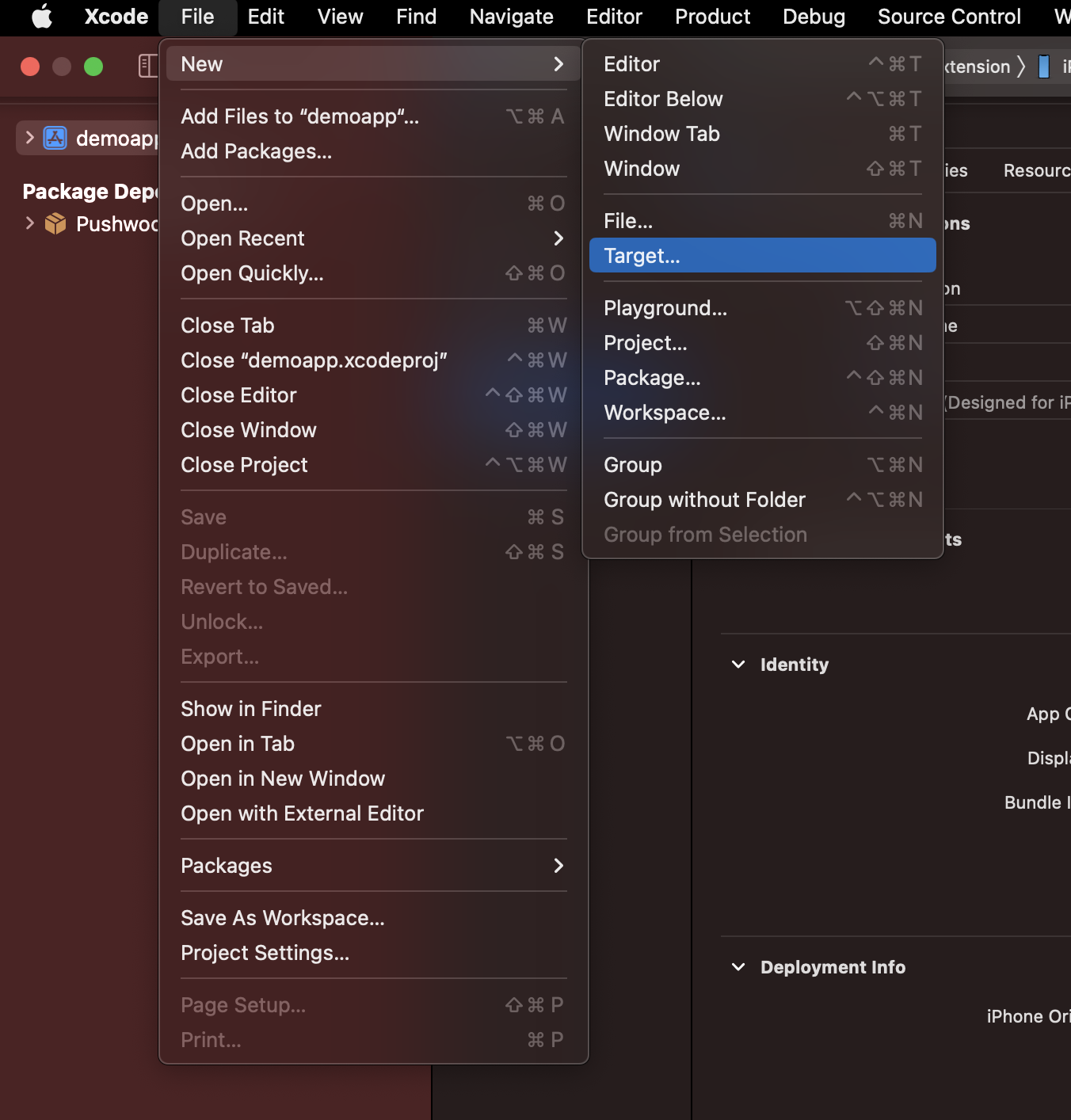 Section titled “1. Добавьте расширение контента уведомлений”В Xcode выберите File > New > Target…