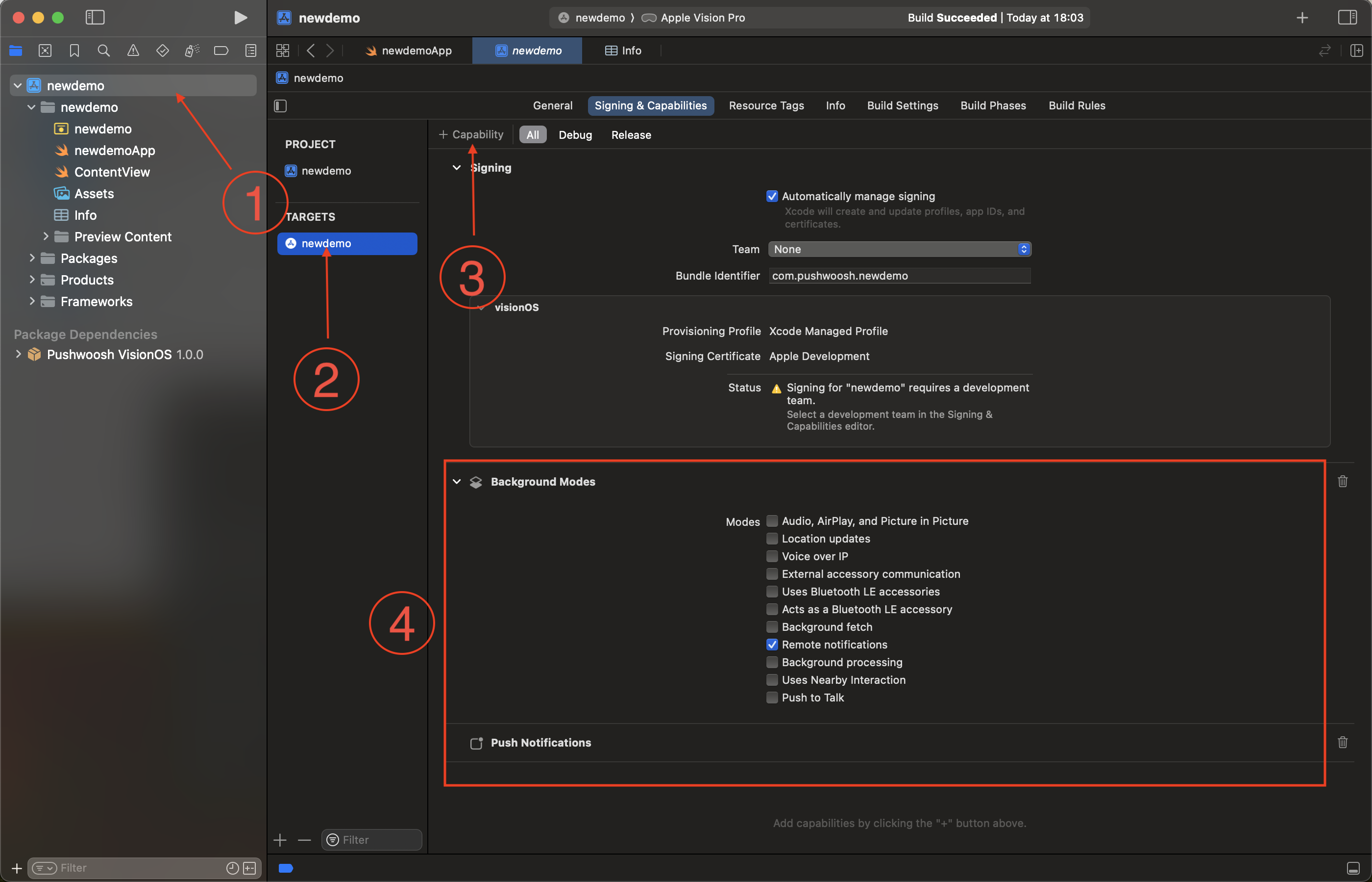 - Затем добавьте возможность Background Modes и установите флажок Remote notifications (4).