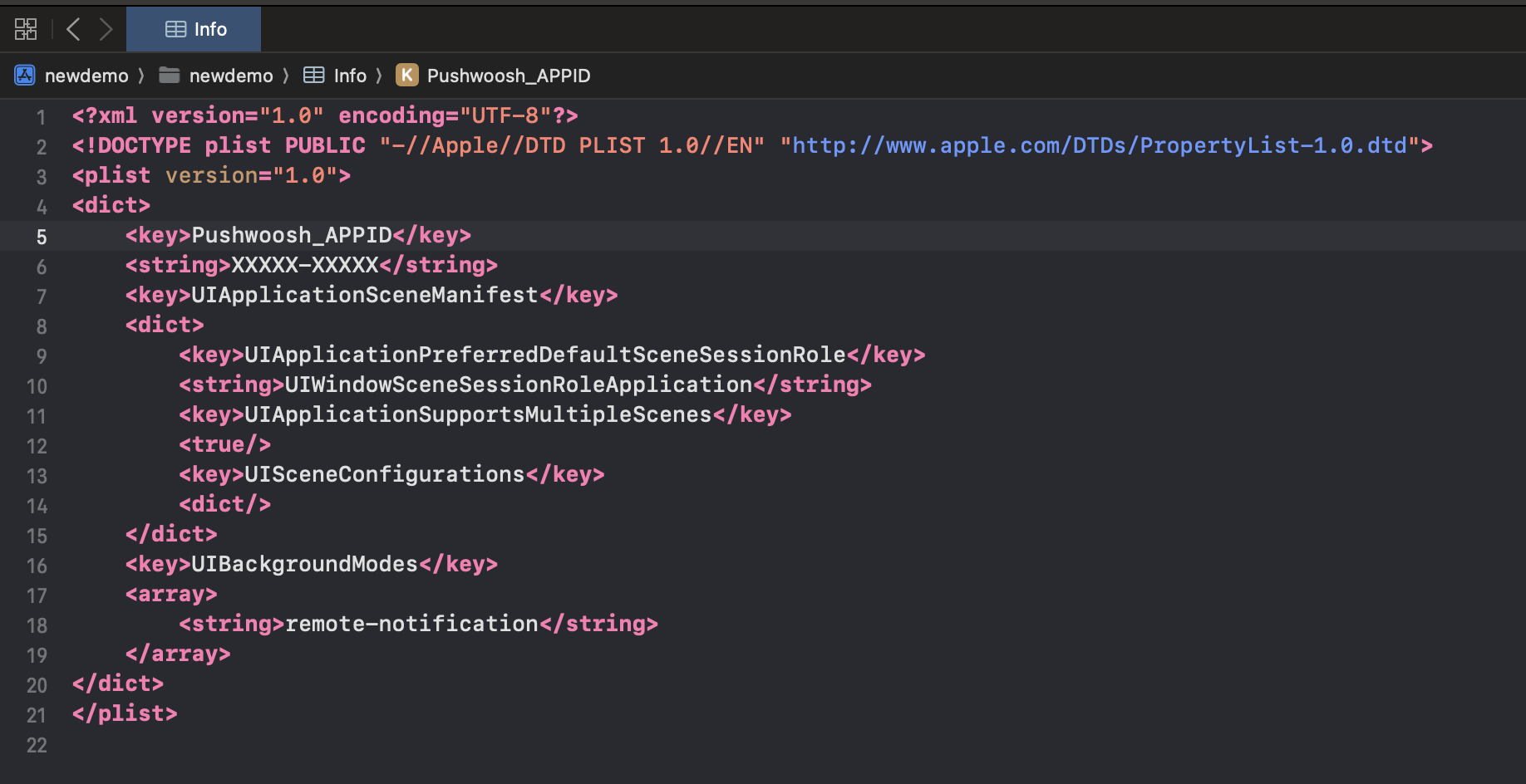 <key>Pushwoosh_APPID</key><string>XXXXX-XXXXX</string>