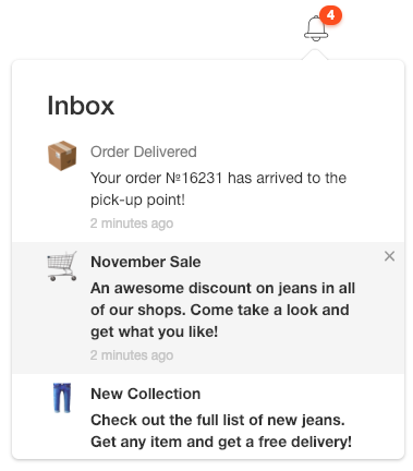 Wavesend.push(['init', { ..., inboxWidget: { enable: true, triggerId: 'pwInbox', emptyInboxIconUrl: 'https://pushon.wavesend.ru/images/icon-empty-inbox.png' // URL-путь к иконке }}]);Чтобы открыть или закрыть виджет, используйте следующий метод API: