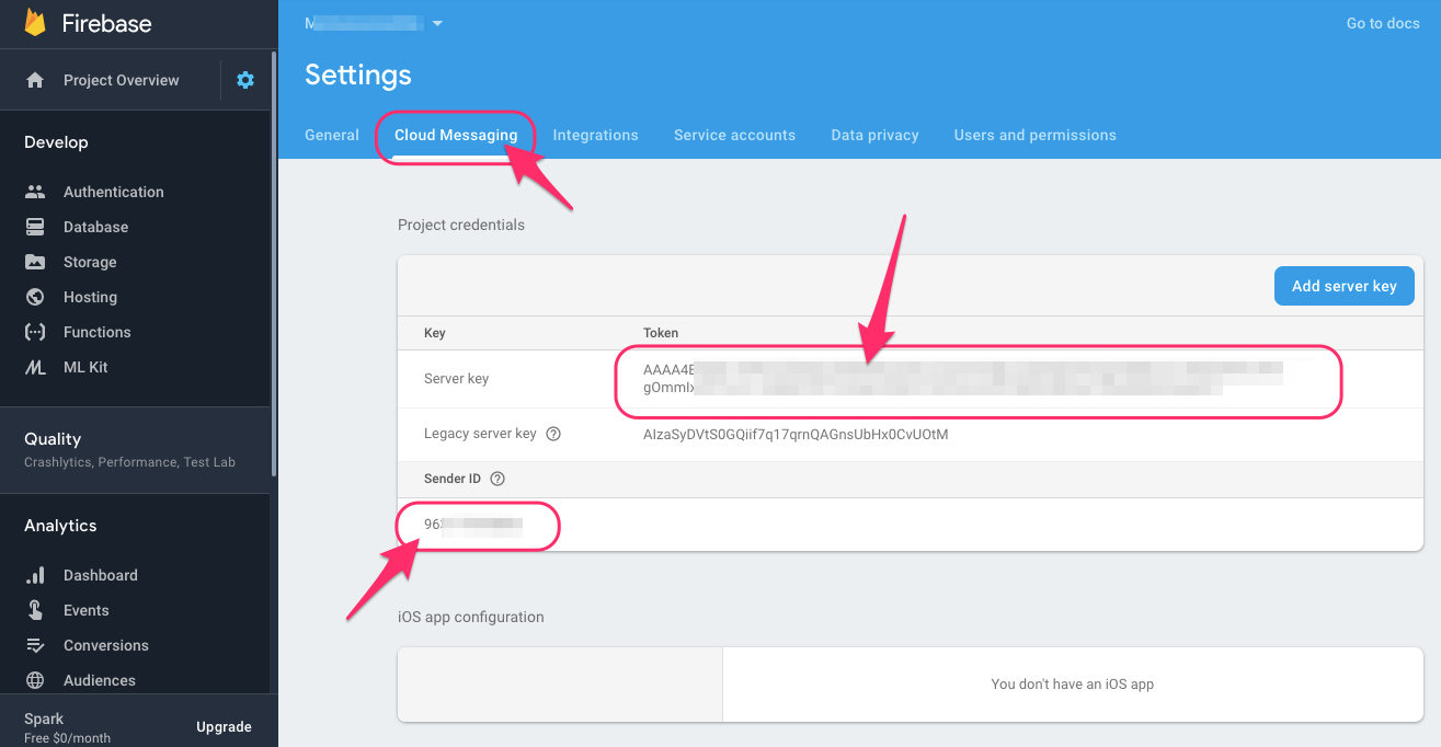 Section titled “Учетные данные Firebase”В консоли Firebase выберите ваш проект, чтобы получить Server Key и Sender ID из Firebase. Для справки см. скриншот ниже: