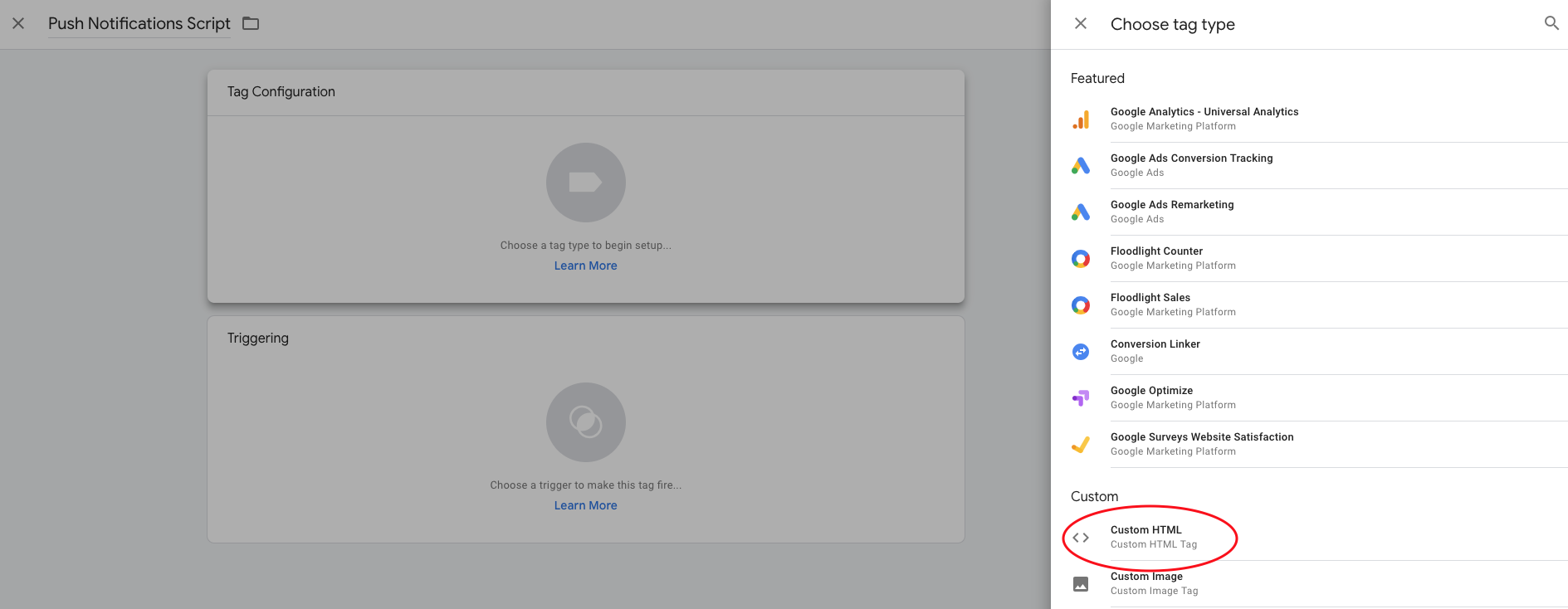 2. Создайте новый Tag и выберите Custom HTML в конфигурации тега.