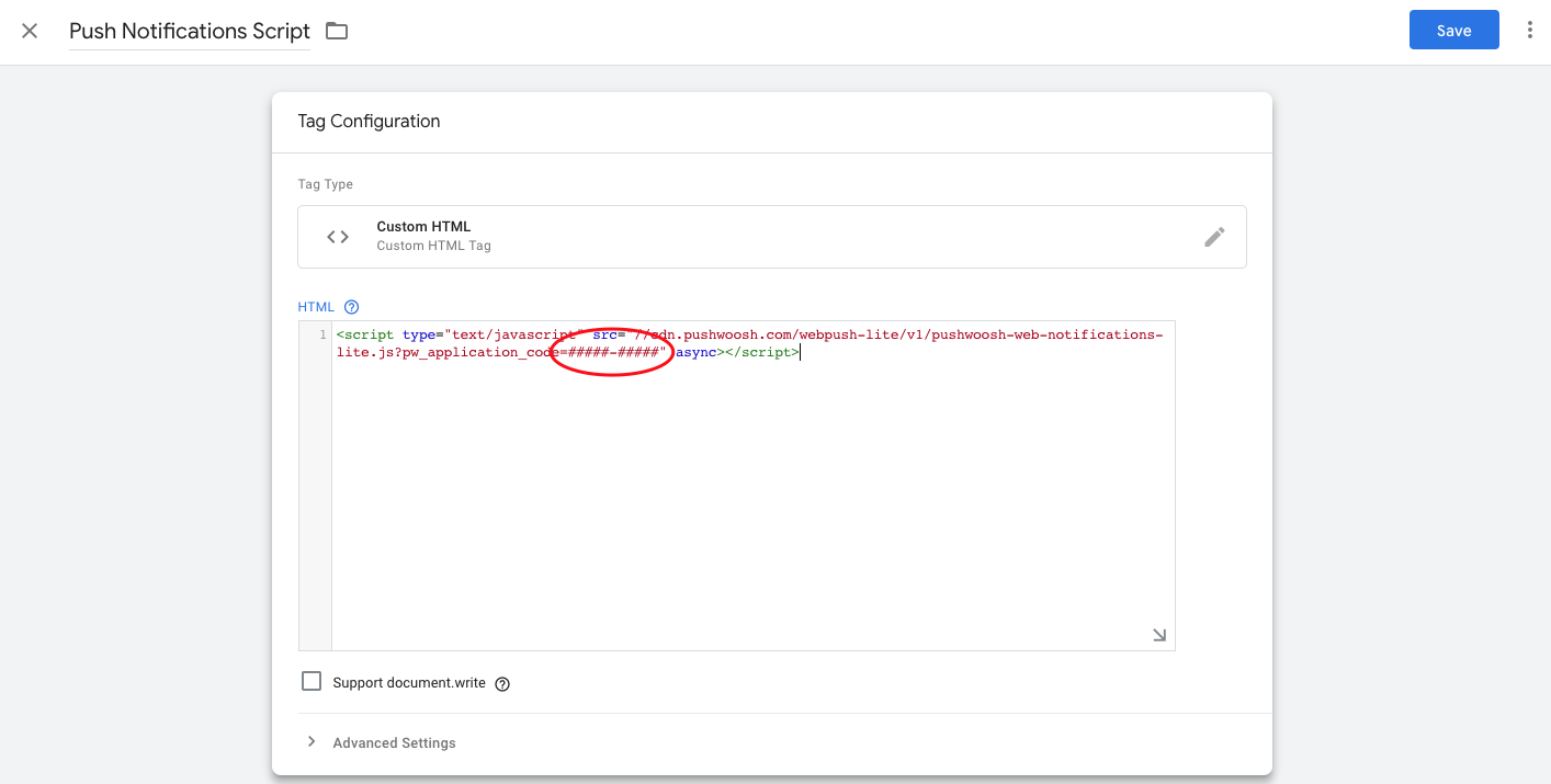 <script type="text/javascript" src="/docs//cdn.wavesend.ru/webpush-lite/v1/wavesend-web-notifications-lite.js?pw_application_code=#####-#####" async></script>4. Замените знаки решетки #####-##### (выделены на рисунке ниже) в скрипте на ваш Application Code Wavesend, который вы получили на шаге 2.