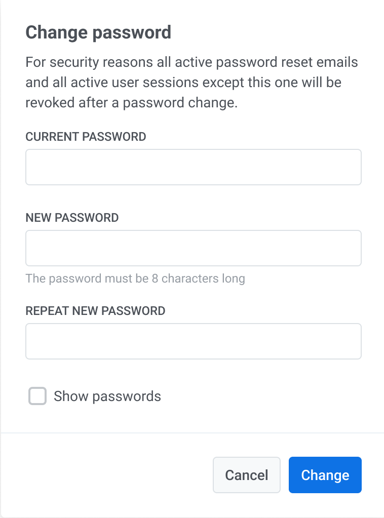 В новом окне введите ваш текущий пароль и новый пароль, затем нажмите Изменить. Обратите внимание, что из соображений безопасности после смены пароля все активные письма для сброса пароля и сеансы пользователей (кроме текущего) будут аннулированы.