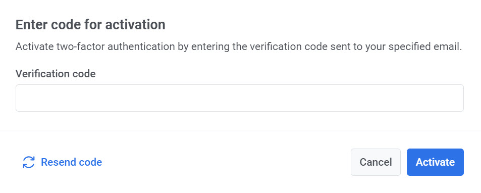 Section titled “Подтверждение по Email”Нажмите Настроить, чтобы получить код подтверждения. Введите код, отправленный на ваш Email, в соответствующее поле, чтобы активировать двухфакторную аутентификацию.