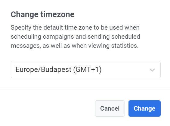 Откроется всплывающее окно, где вы сможете выбрать желаемый часовой пояс по умолчанию. После выбора предпочитаемого часового пояса нажмите кнопку Изменить для подтверждения изменений. Выбранный вами часовой пояс будет использоваться для планирования кампаний, отправки запланированных сообщений и просмотра статистики.