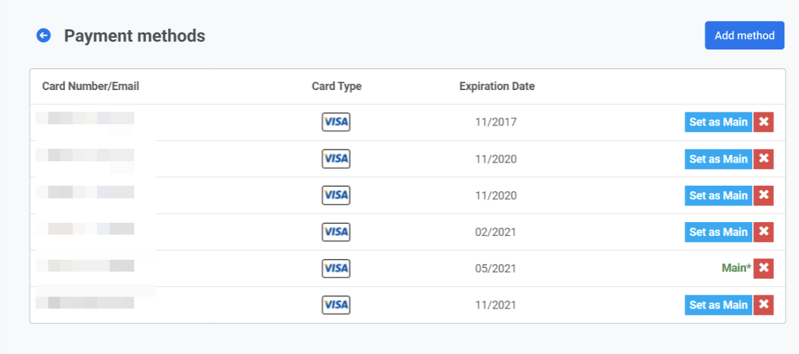В списке способов оплаты у вас есть возможность добавить новый способ, установить один из них как основной, удалить существующий способ или обновить данные карты.