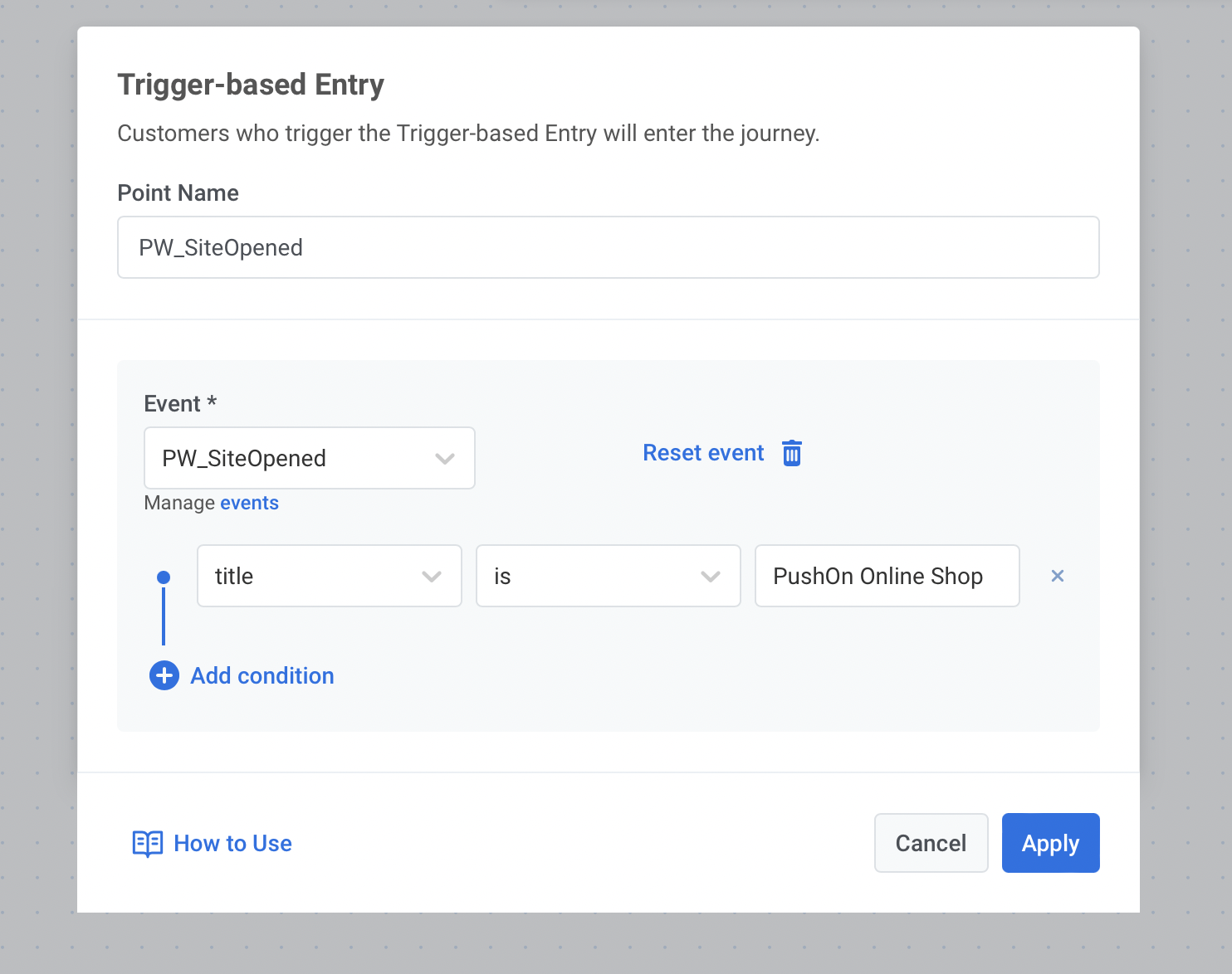 После активации события по умолчанию можно использовать в сообщениях, основанных на поведении, например, в качестве Trigger-based Entry в Customer Journey или как триггер для In-App сообщений.