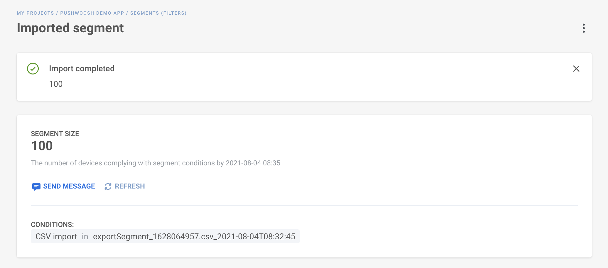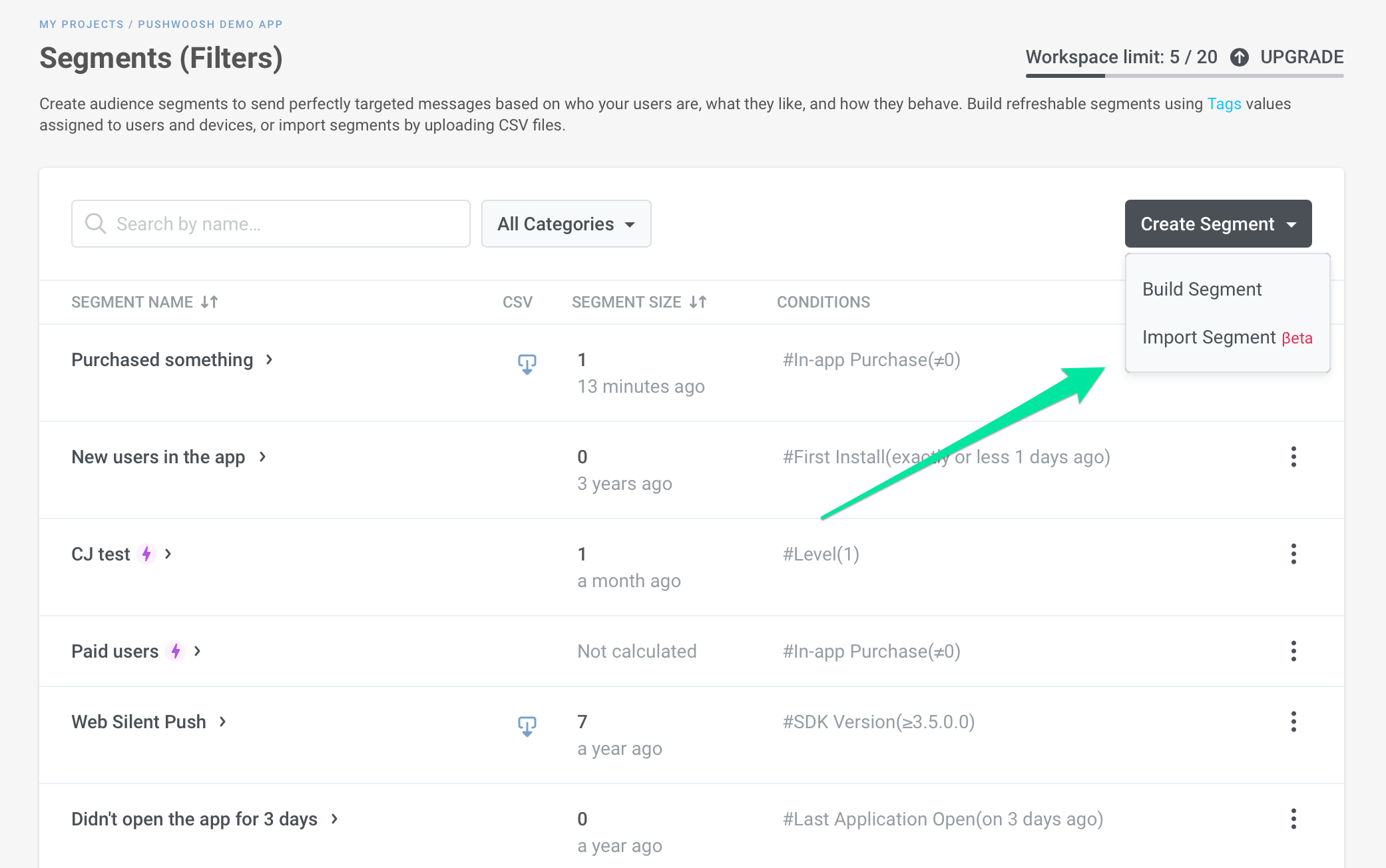 В списке Segments вы увидите количество пользователей в Segment, время последнего обновления размера Segment и условия, на основе которых он построен.