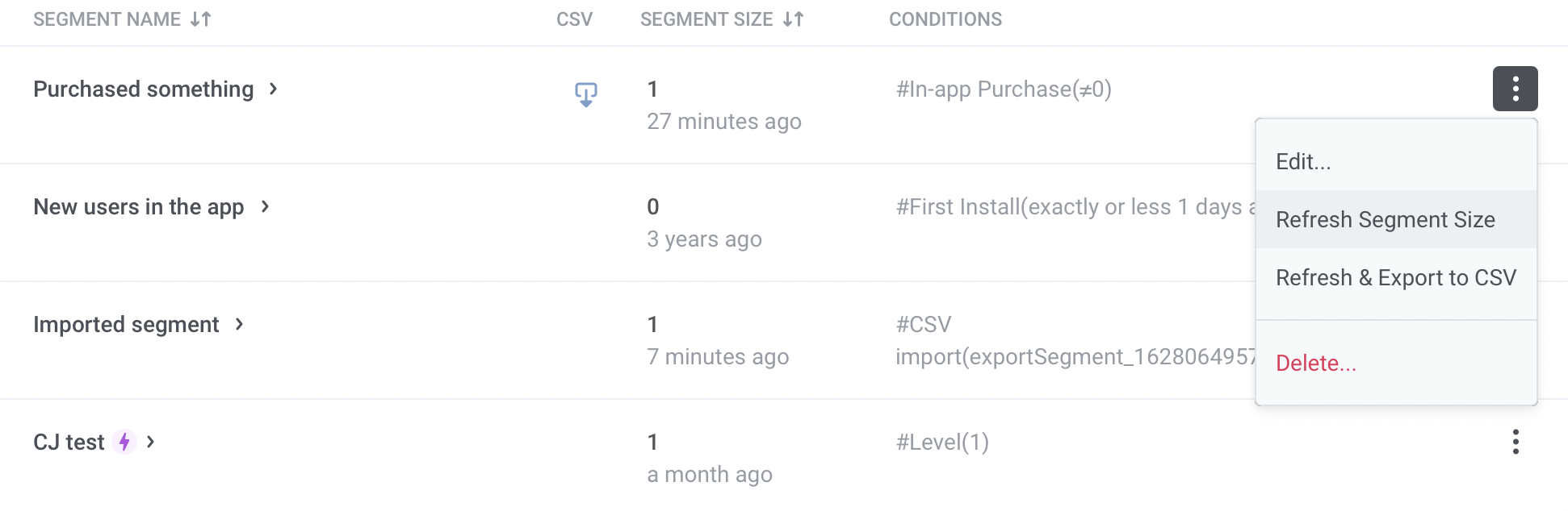 Section titled “Обновление и экспорт в CSV”Чтобы получить актуальный размер Segment, выберите опцию «Обновить размер Segment» в меню с тремя точками. Если вы хотите скачать CSV-файл Segment, нажмите «Обновить и экспортировать в CSV»; когда CSV-файл будет готов к скачиванию, в столбце CSV появится значок загрузки.