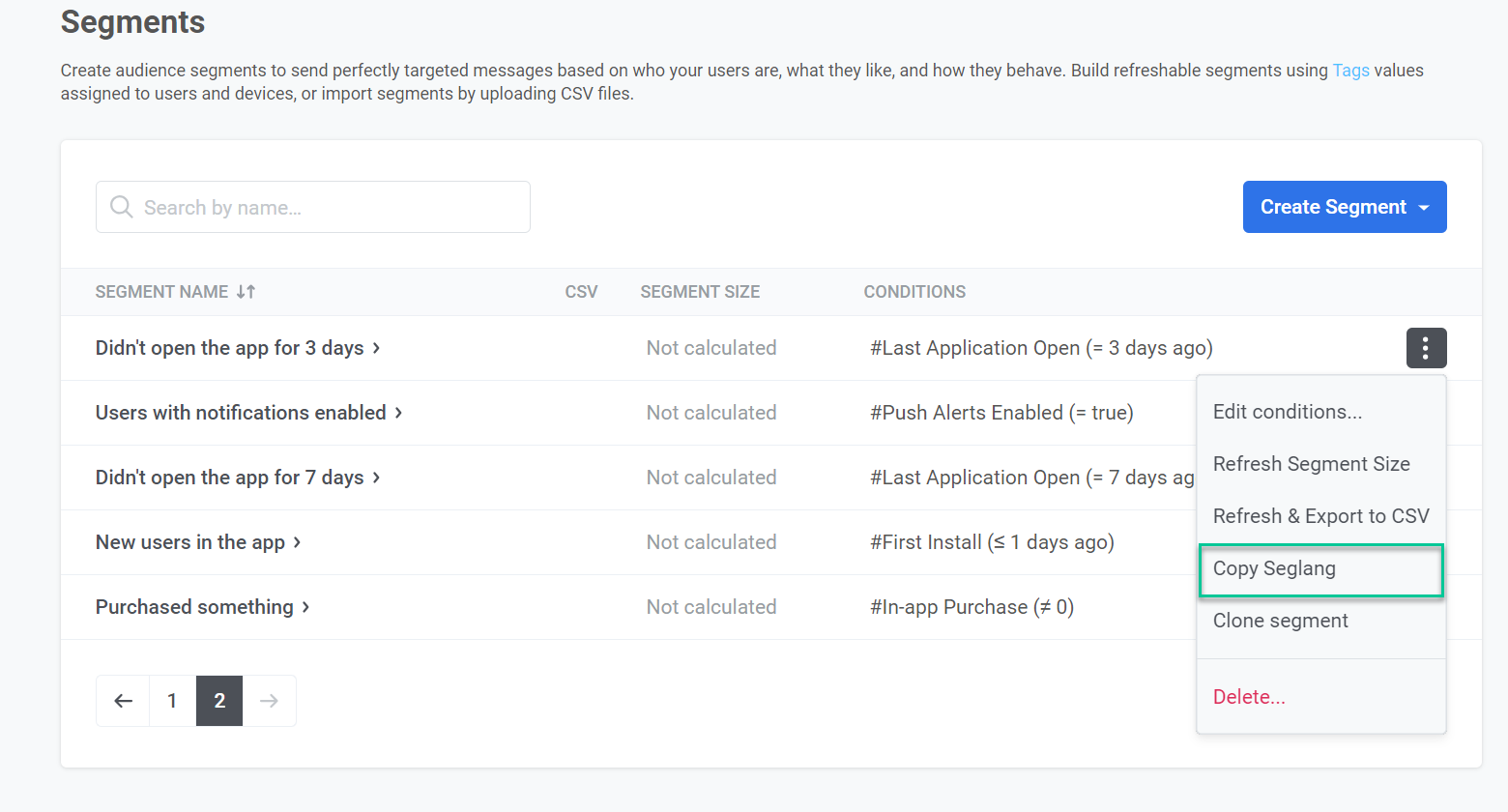 Опция Копировать Seglang позволяет скопировать базовую логику созданного вами Segment. Скопированный язык сегментации затем можно использовать в вызовах API, например, в API-методе createmessage или в API-based-точках входа в Customer Journey, чтобы воспроизвести ту же логику сегментации.