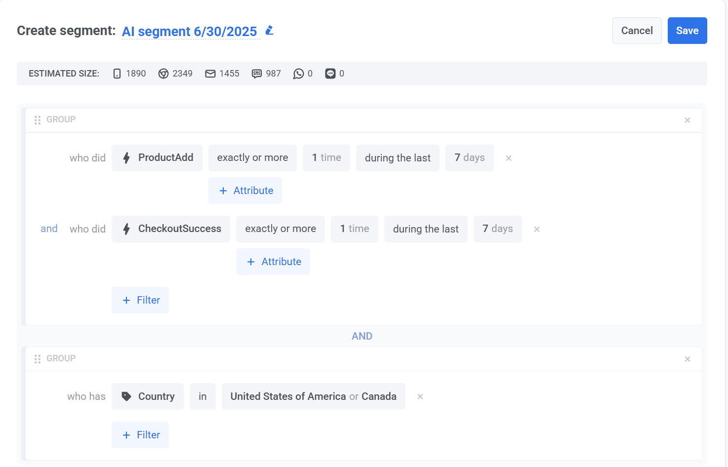 В появившемся окне введите описание Segment, который вы хотите создать, на естественном языке. Например: «Пользователи, которые добавили товары в корзину, но не завершили покупку в течение последних 7 дней, и находятся в США или Канаде».