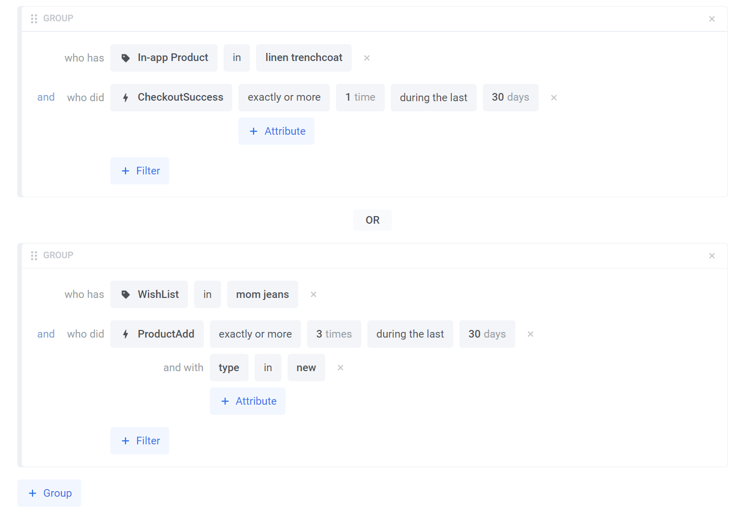 Вы можете использовать один и тот же Tag несколько раз для создания более сложных Segments на основе различных комбинаций условий. Например, вам может понадобиться Segment пользователей, которые купили пальто в вашем приложении, но не купили перчатки — для этого добавьте Tag In-App Product с соответствующими операторами и значениями, и готово.