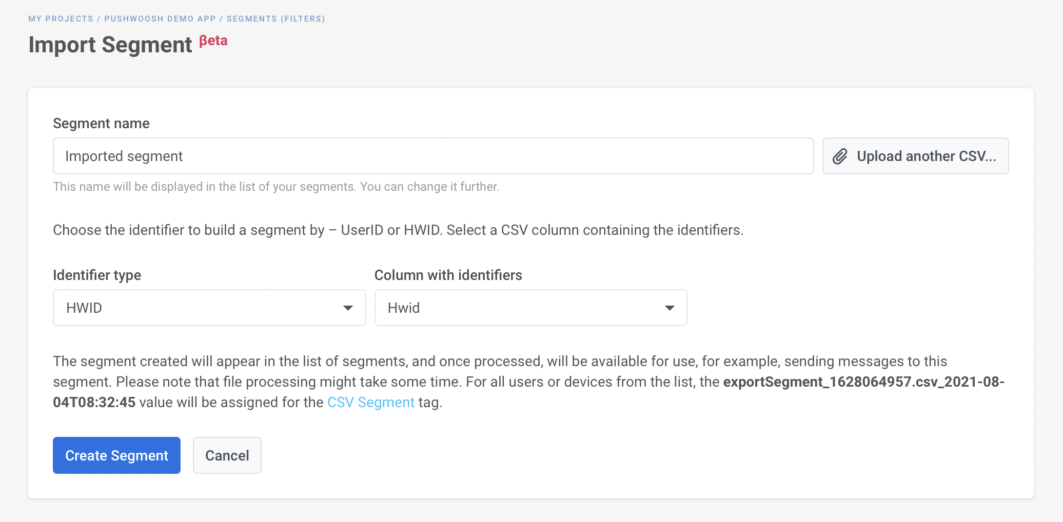 Загружаемый CSV-файл должен содержать UserID или HWID, зарегистрированные для Project, для которого вы создаете Segment. Если CSV-файл не содержит User ID или HWID, Segment создан не будет. Если User ID или HWID, содержащиеся в CSV, не зарегистрированы для Project, они будут пропущены при импорте Segment.