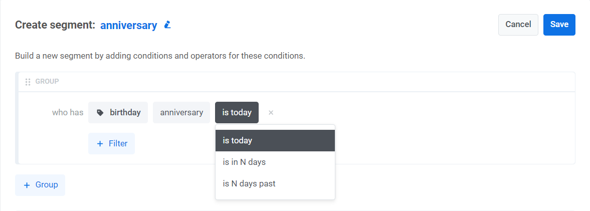 Section titled “Создание Segment по годовщине”Wavesend позволяет создавать Segments на основе годовщины определенного Tag с датой. Это позволяет вам нацеливаться на пользователей, у которых значимые даты, такие как дни рождения или первая установка приложения, приходятся на один и тот же день каждый год.
