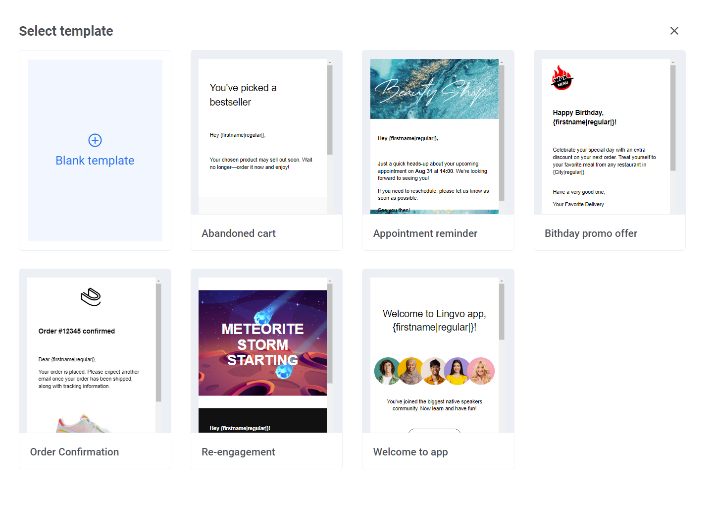 В Drag & drop редакторе вы можете начать с нуля или выбрать один из множества готовых шаблонов. Имеются готовые шаблоны для распространенных сценариев, таких как брошенные корзины, напоминания о встрече, подтверждения заказов и повторное вовлечение. Вы можете легко редактировать и настраивать эти шаблоны под свои нужды.