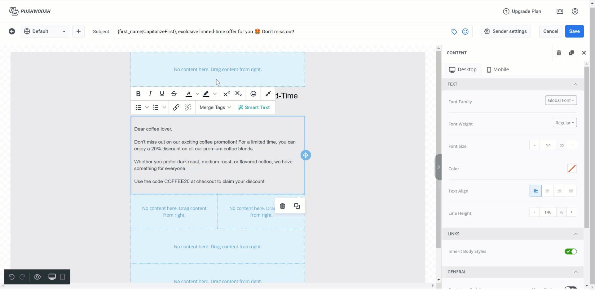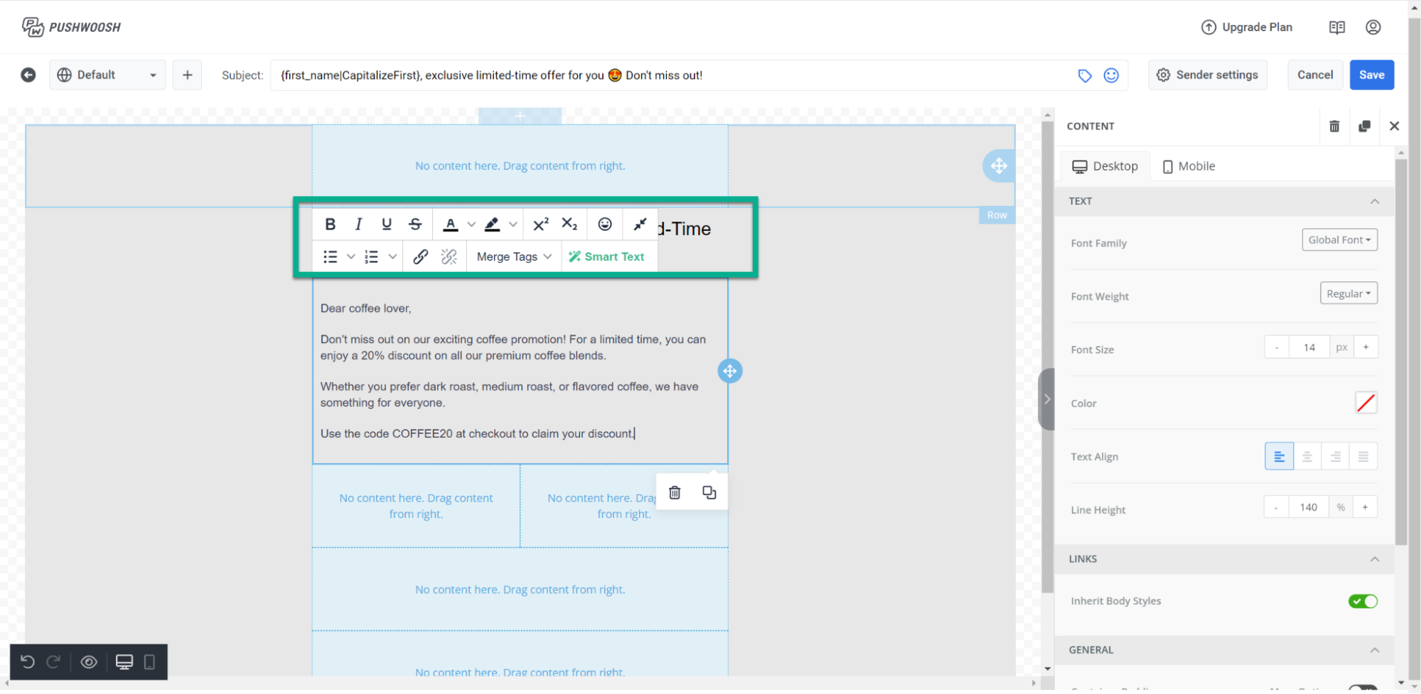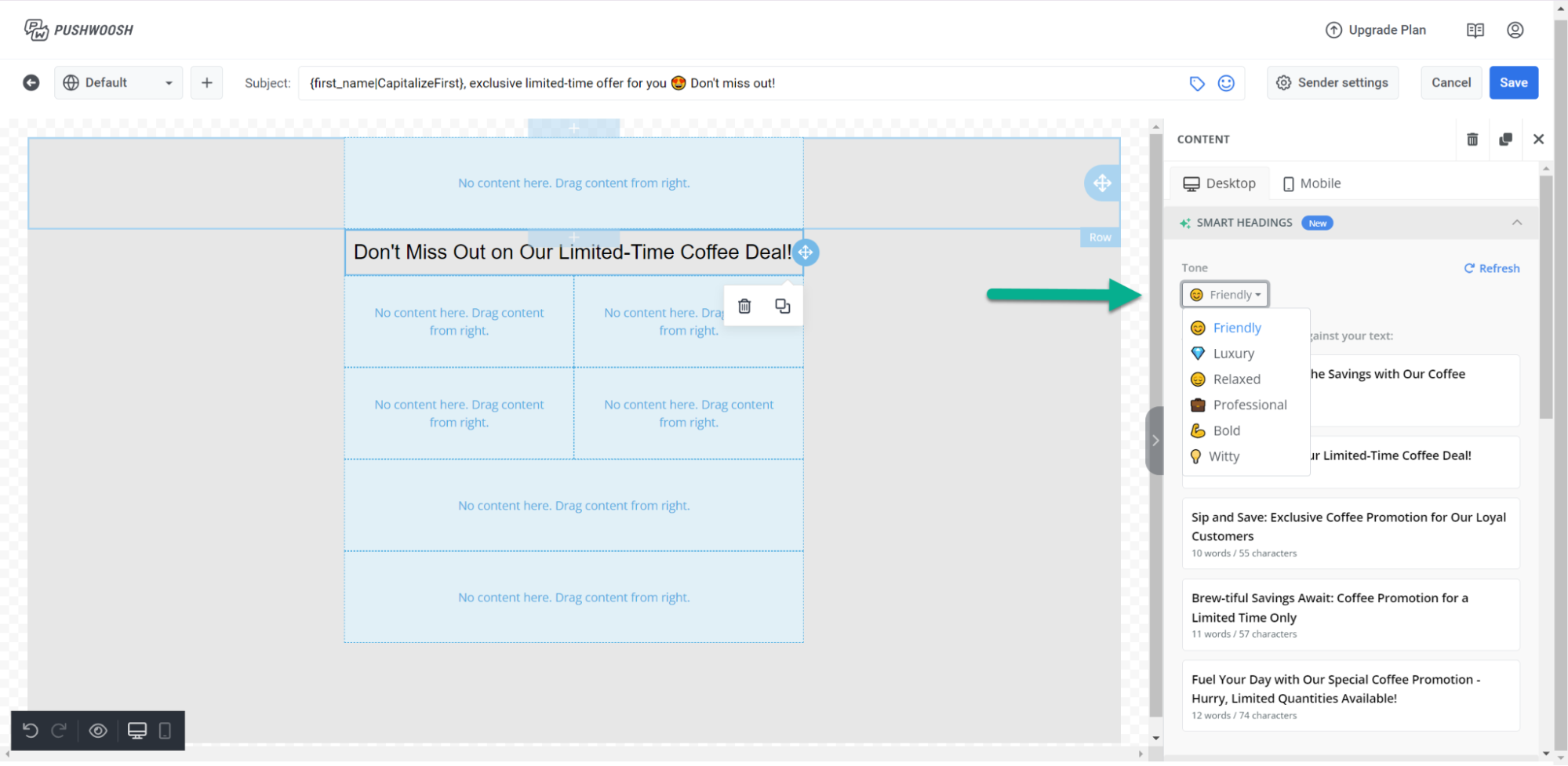 Чтобы включить эти элементы контента в ваше письмо, просто выберите элемент из меню и перетащите его в письмо слева.