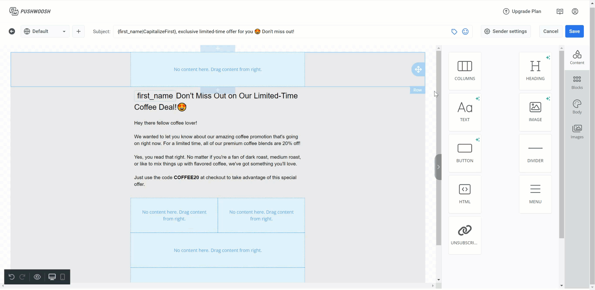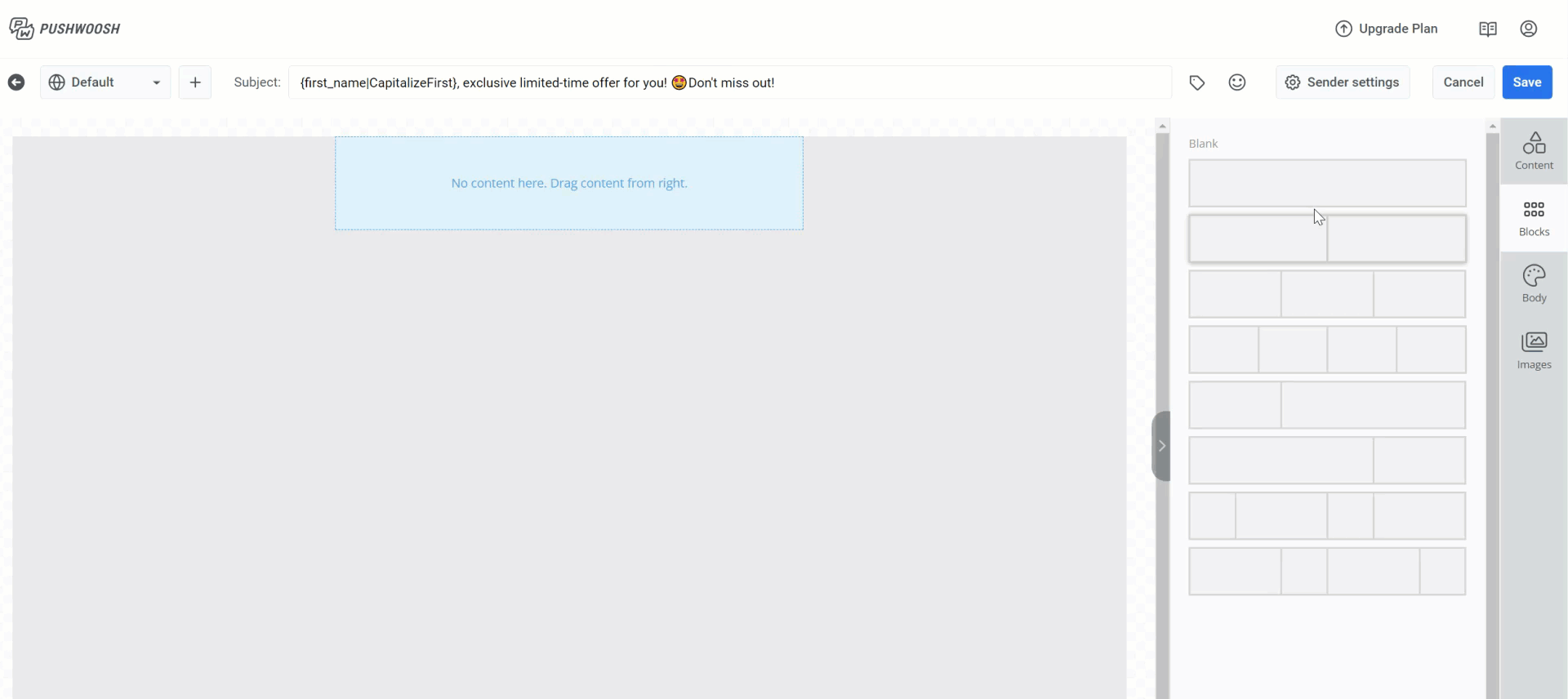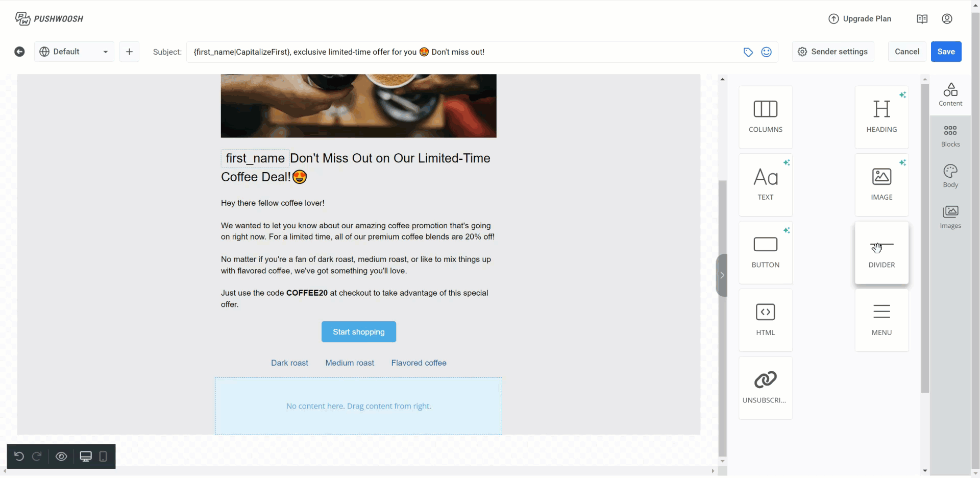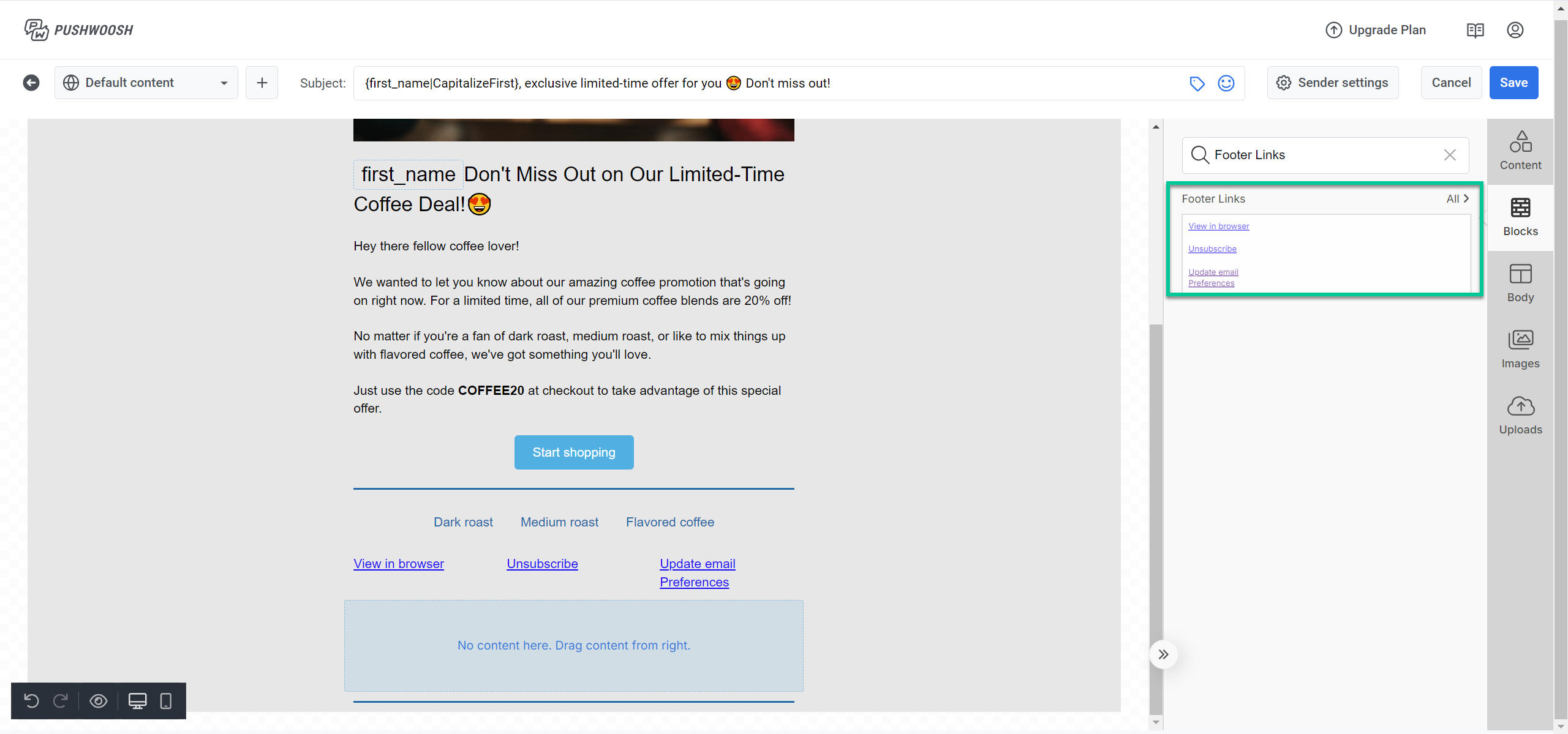 Чтобы создать макет письма, перетащите блоки из панели редактора в тело письма.