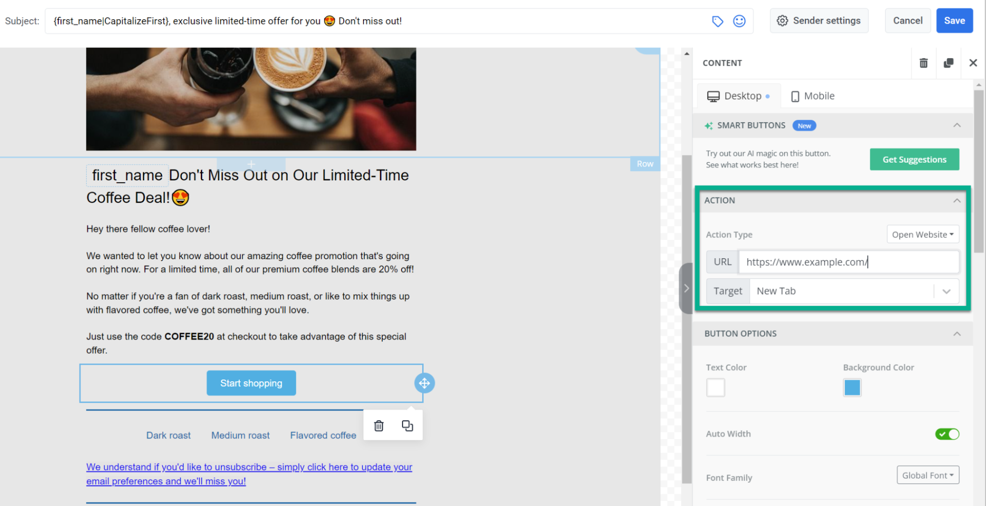Section titled “Unsubscribe link”Обязательно добавьте Unsubscribe link в свое письмо, чтобы предоставить получателям возможность легко отказаться от будущих сообщений, соблюдая законодательство и уважая их предпочтения относительно получения писем.