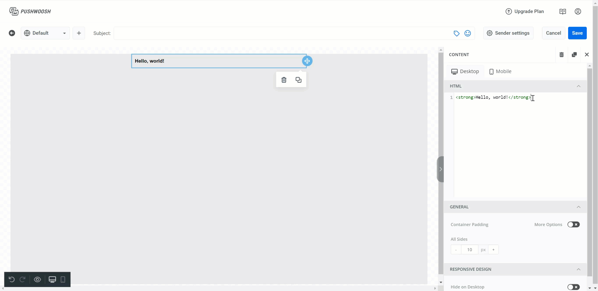 Section titled “Добавление HTML”Вы также можете вставлять HTML-код в свое письмо. Для этого перетащите элемент HTML влево и вставьте код в поле HTML в правой панели.