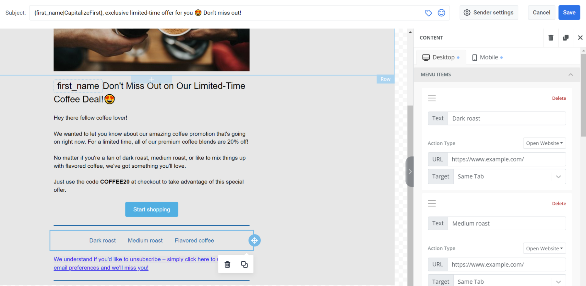 Section titled “Добавление меню”Вы можете вставить в письмо интерактивное меню, чтобы упростить навигацию и повысить кликабельность, предлагая получателям организованный и увлекательный способ изучения вашего контента.