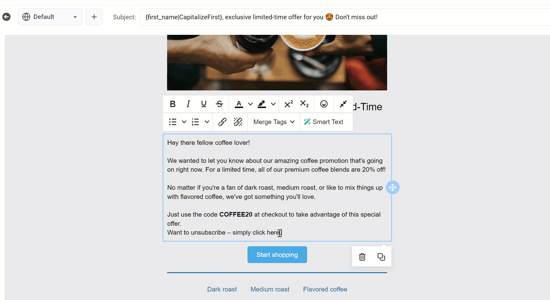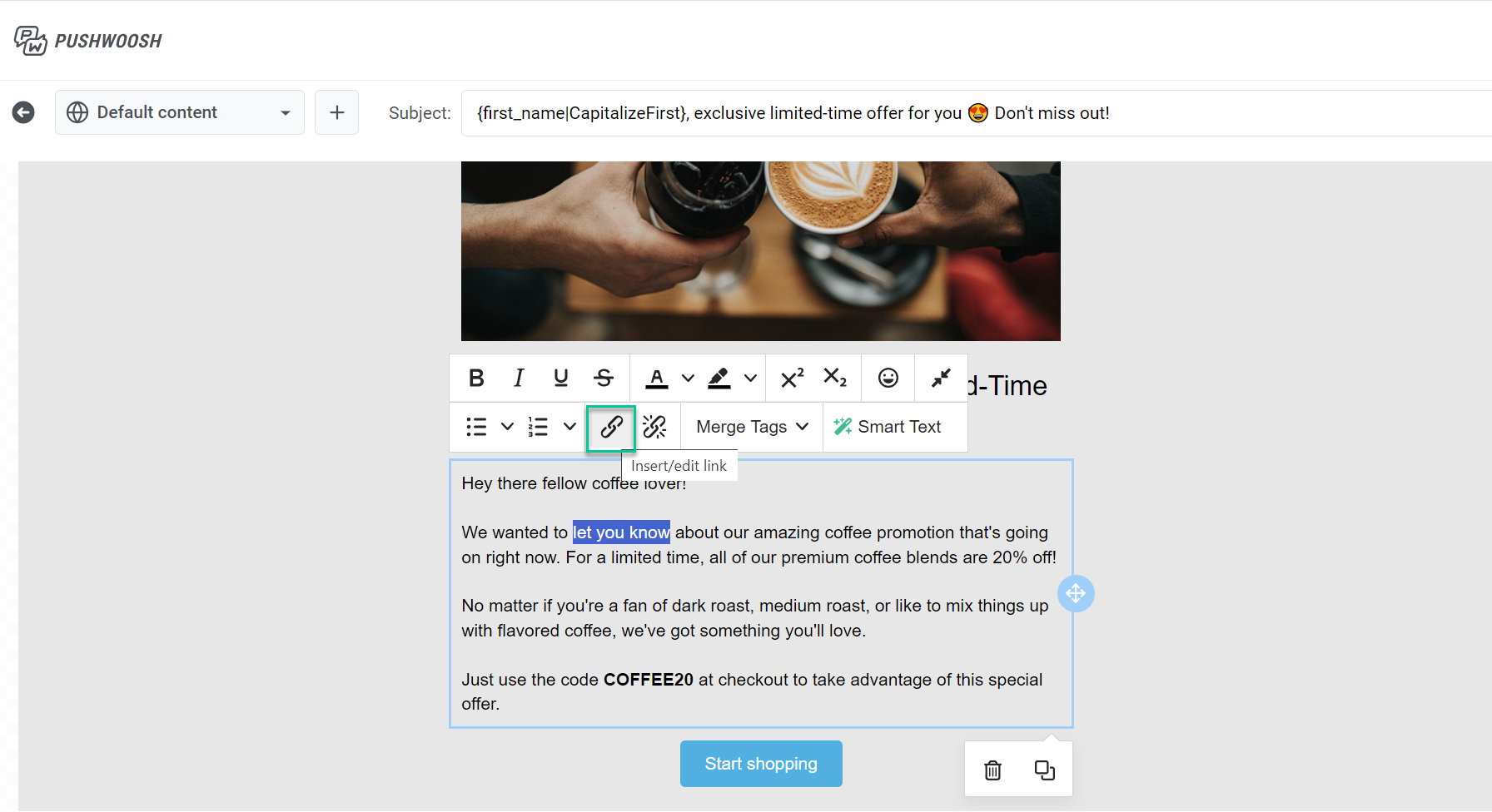 Section titled “Персонализация текста”Чтобы персонализировать текст, нажмите Теги слияния на панели инструментов и выберите тег, который вы хотите включить, из выпадающего меню.