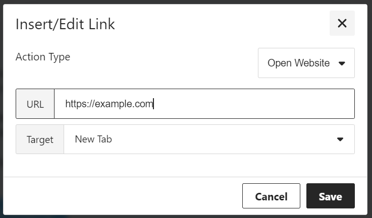 Section titled “Открыть сайт”Выберите эту опцию, чтобы вставить гиперссылку, которая направляет получателя на внешний веб-сайт. При нажатии получатель будет перенаправлен на указанную вами веб-страницу.