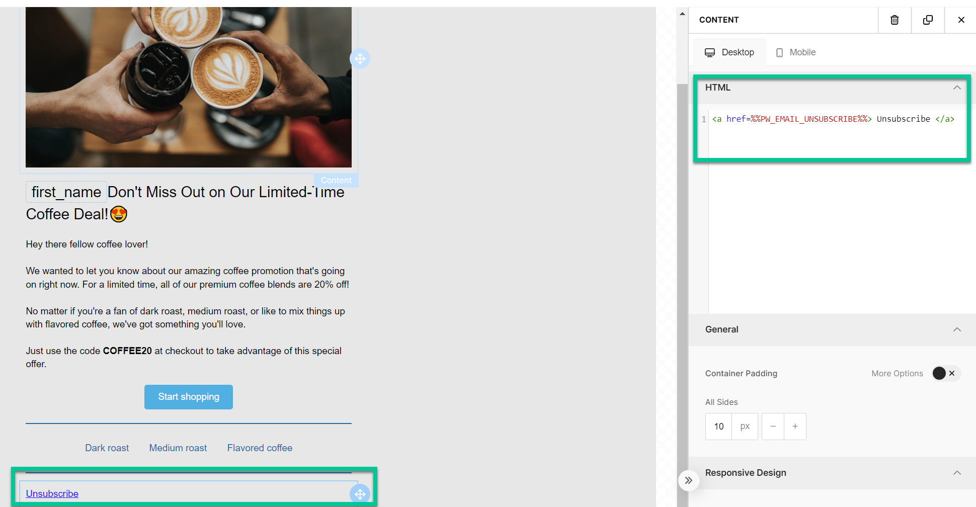 Если вы хотите вставить Unsubscribe link напрямую в письмо через HTML, добавьте Unsubscribe link в ваше письмо следующим образом: