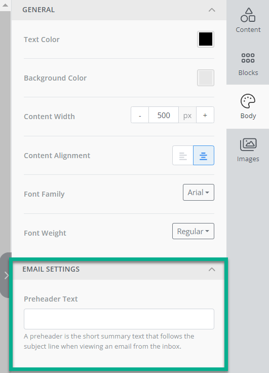 Section titled “Настройка общих параметров контента”Кроме того, на вкладке Структура вы можете настроить общие параметры вашего письма, включая такие элементы, как цвет текста, цвет фона, ширина контента, выравнивание, семейство и начертание шрифта и т. д.