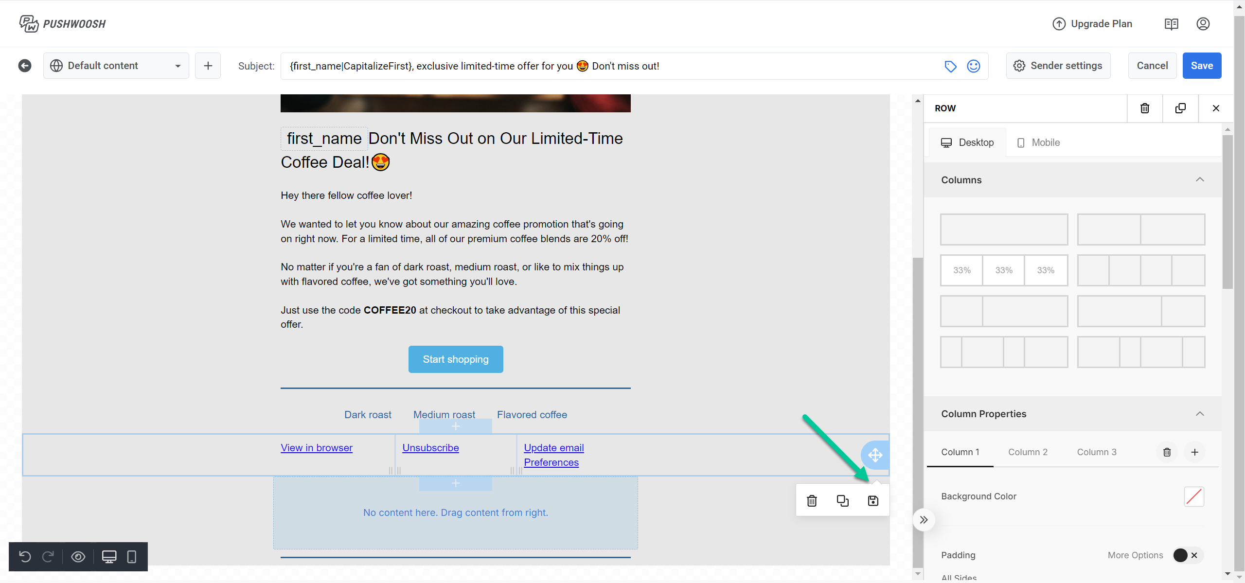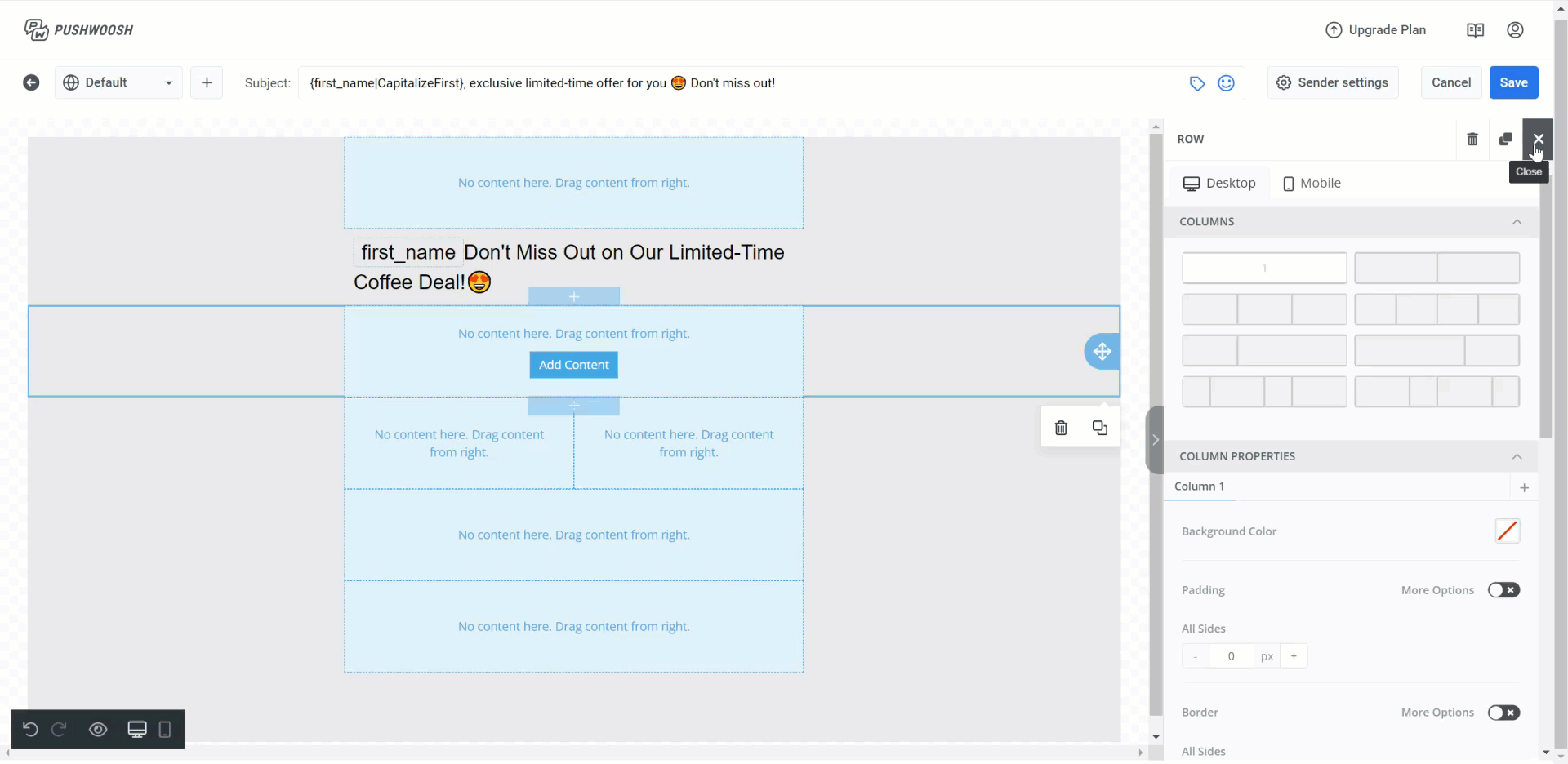 Drag & drop редактор email-рассылок предлагает гибкость в настройке макета письма под ваши нужды. Вы можете добавлять столько строк, сколько необходимо, с разным количеством колонок.