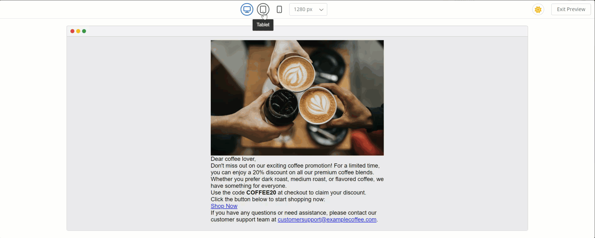 Section titled “Предпросмотр и сохранение письма”Когда контент вашего письма готов, вы можете увидеть, как он будет выглядеть, нажав на иконку Предпросмотр внизу редактора. Здесь вы можете увидеть предпросмотр для десктопных, планшетных и мобильных устройств, а также проверить, как ваше письмо будет выглядеть в темном и светлом режимах.