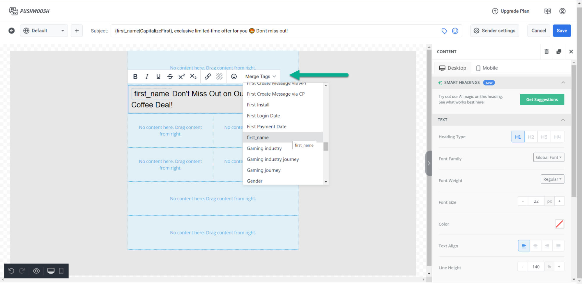 Section titled “Персонализация заголовка”Вы также можете персонализировать заголовок прямо с панели инструментов. Для этого просто выберите Теги слияния и в выпадающем меню выберите тег, который вы хотите включить в заголовок.