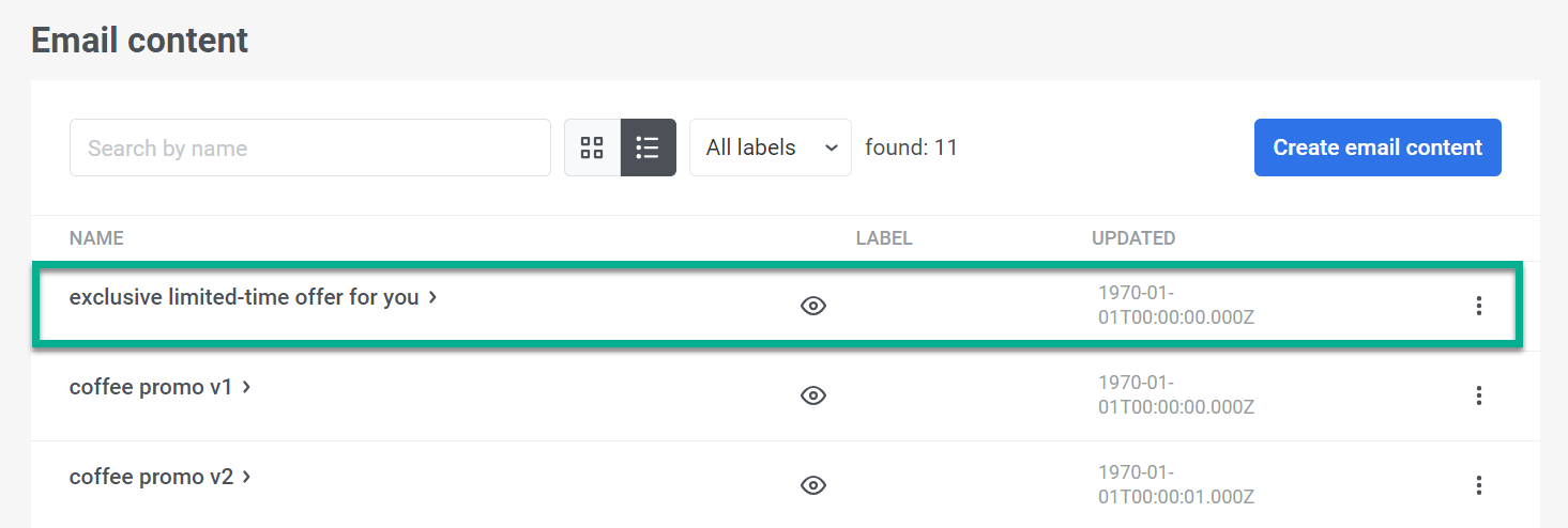 Section titled “Управление контентом Email”После создания и сохранения ваш Email появится в вашем списке контента Email.